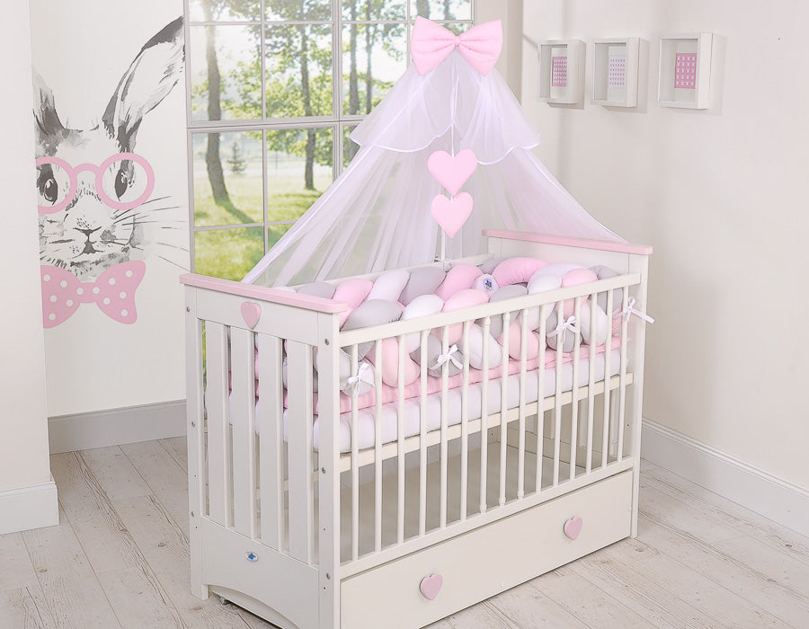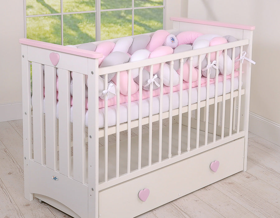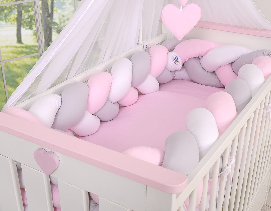 Denna vackra, extra mjuka flätade spjälskydd är tillverkad av 100 % bomull. Knutskyddet fästs enkelt på spjälsängsstängerna och skyddar ditt barns händer och fötter från att klämmas. Den förhindrar också att huvudet eller kroppen stöter mot spjälsängens väggar.