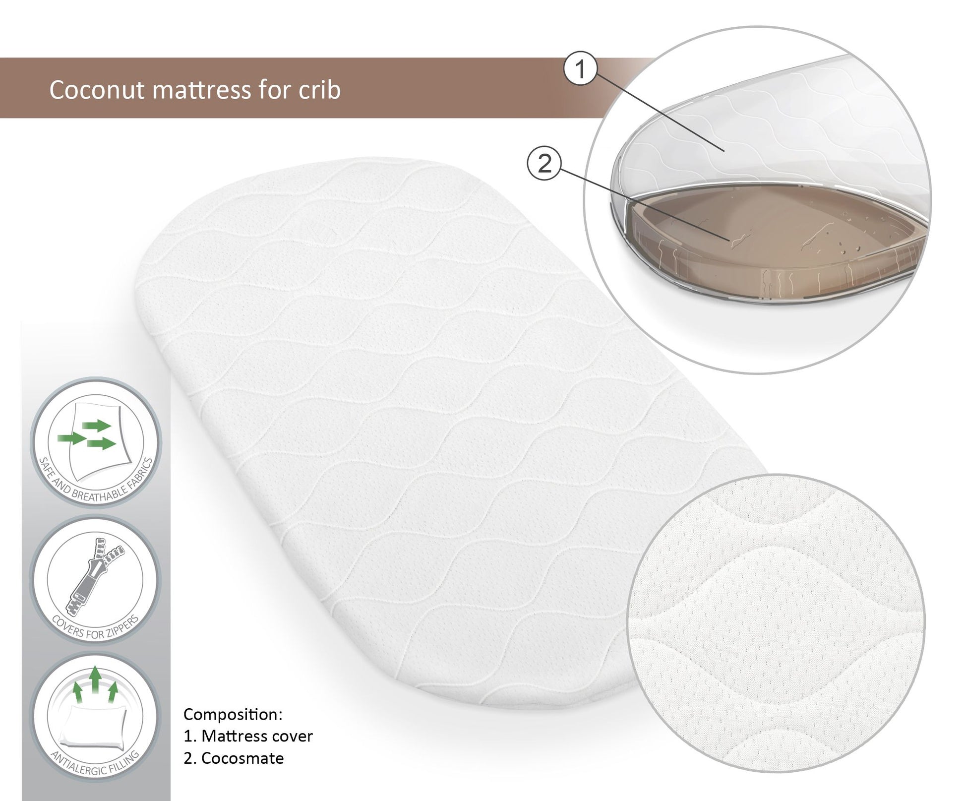 En högkvalitativ, andningsbar och hälsosam kokosmadrass, perfekt för spjälsäng eller korg. Tillverkad av naturlig kokosfiber, komprimerad till en flexibel matta. Den har ett quiltat överdrag för extra komfort.