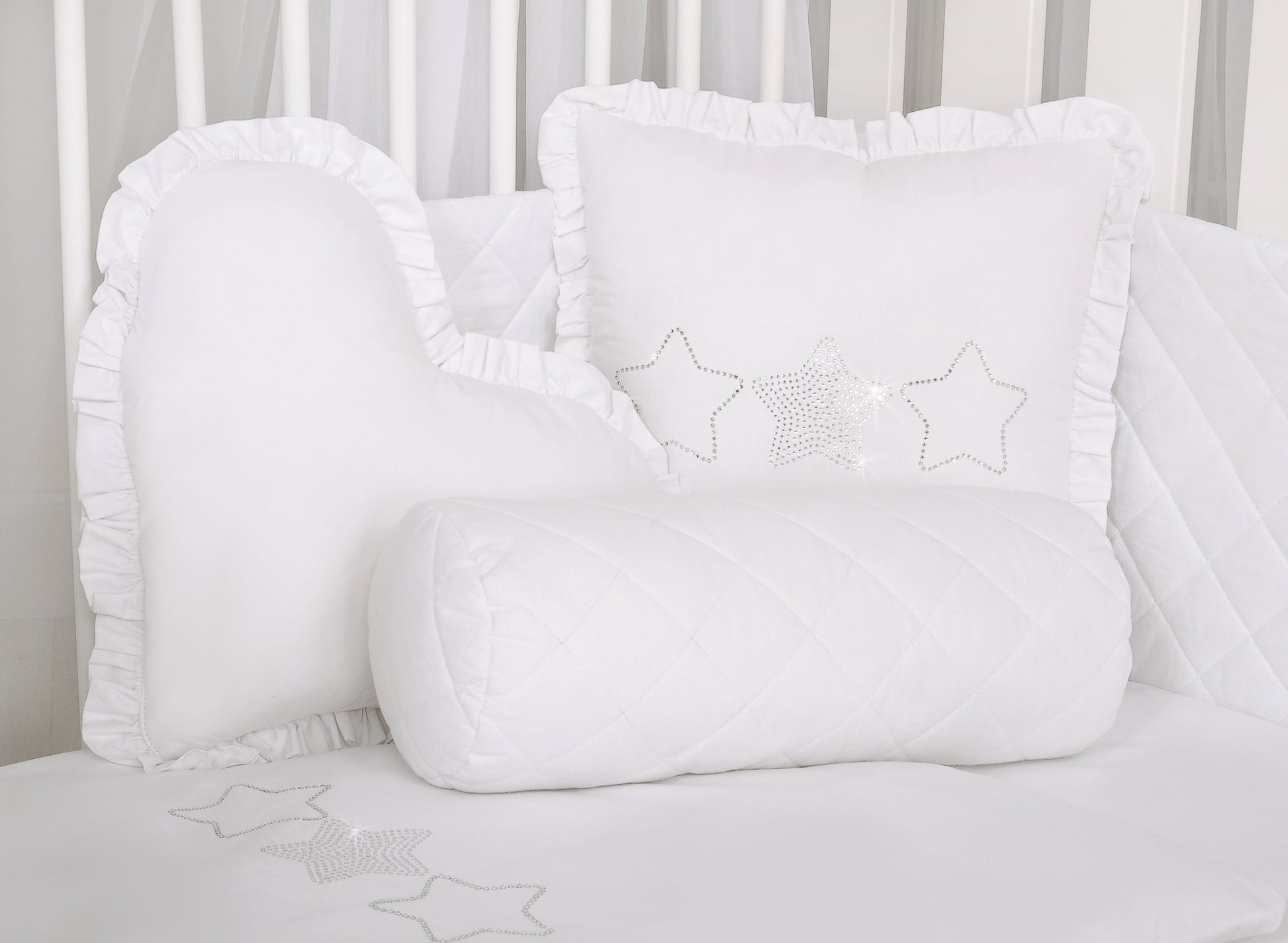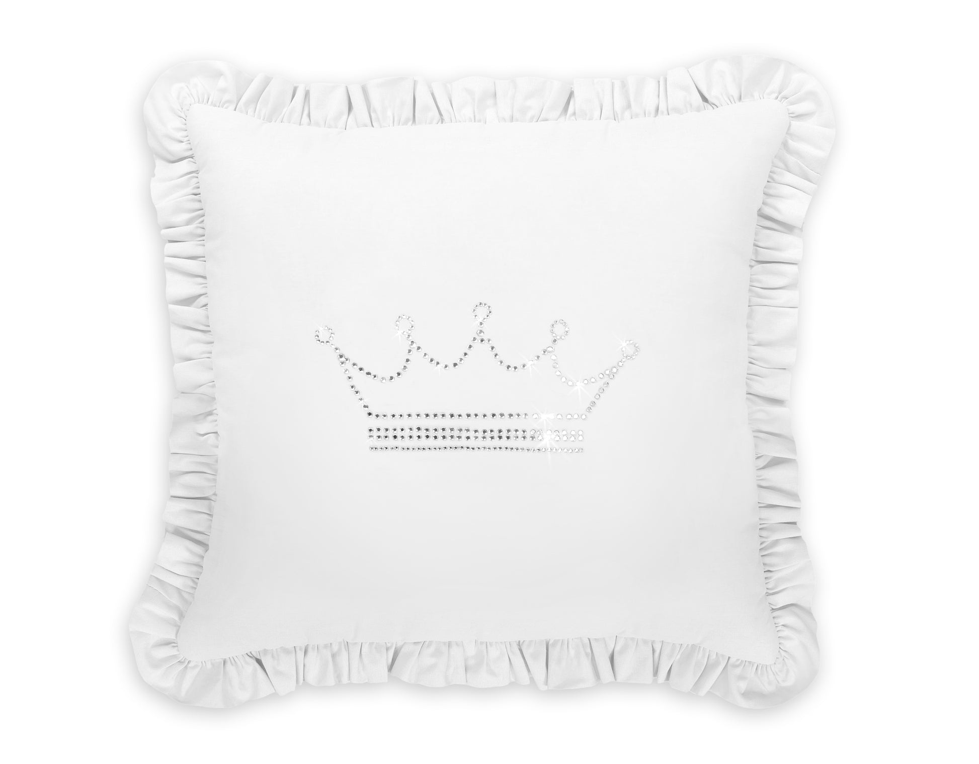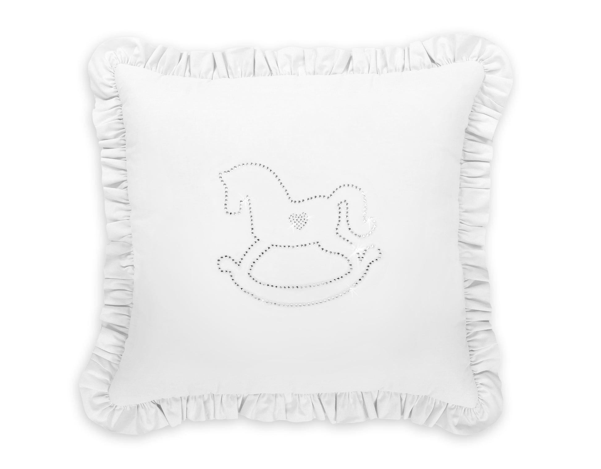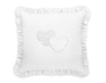Elegant kudde med en fin applikation och lekfulla volanger. Kuddfodralet sticker ut med en skimrande dekoration av fina zirkoniastenar på mjuk, slät bomull.