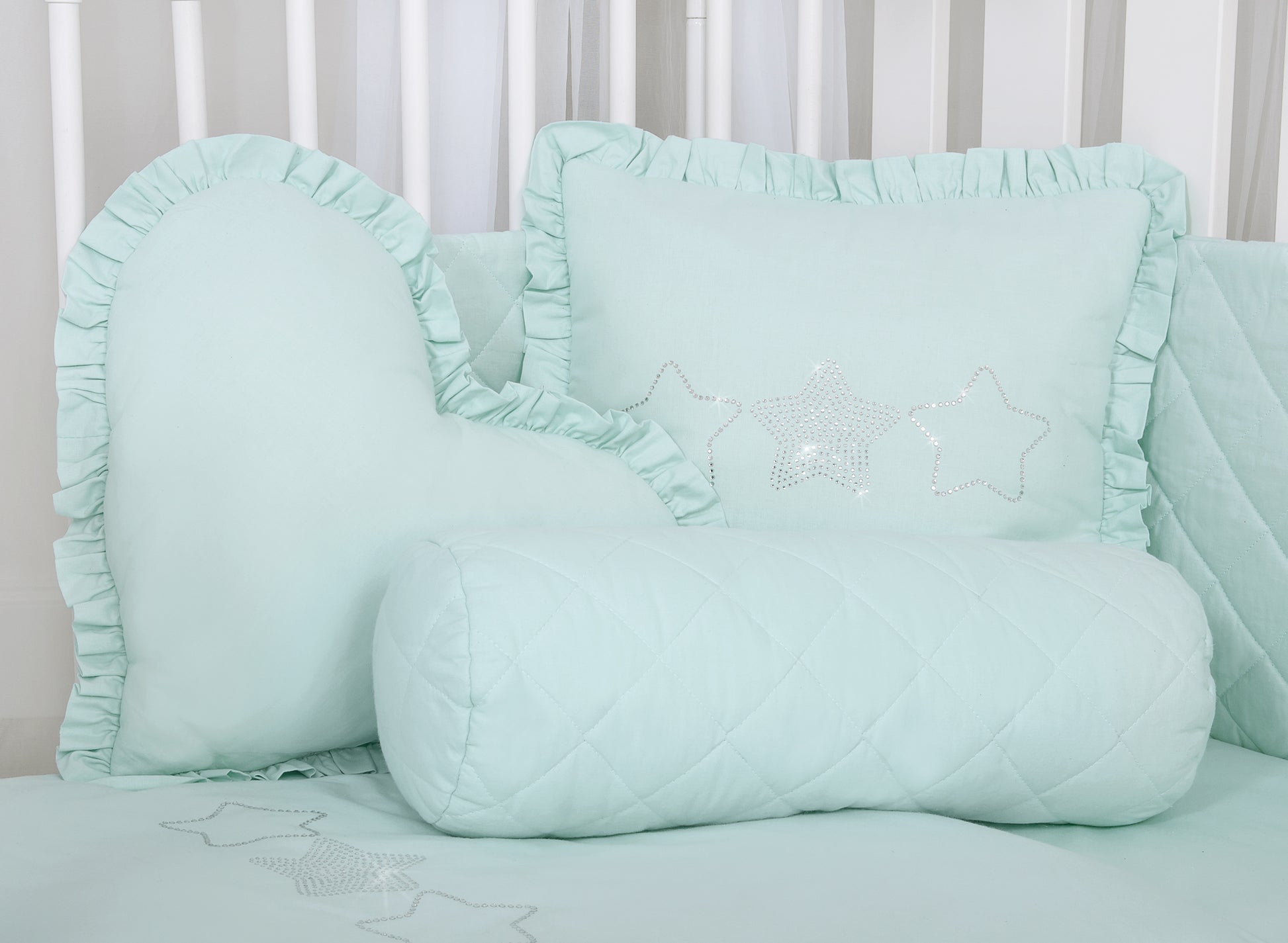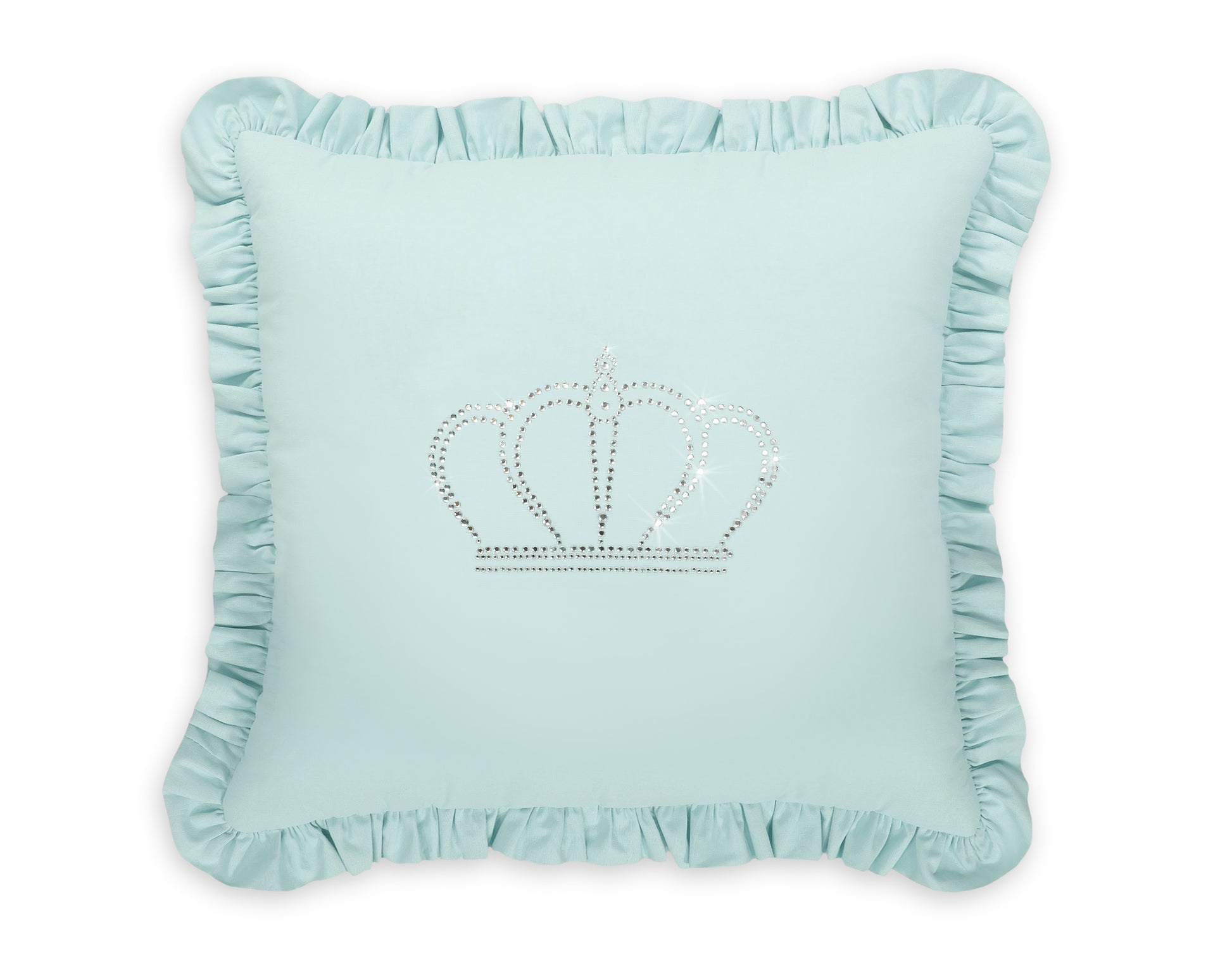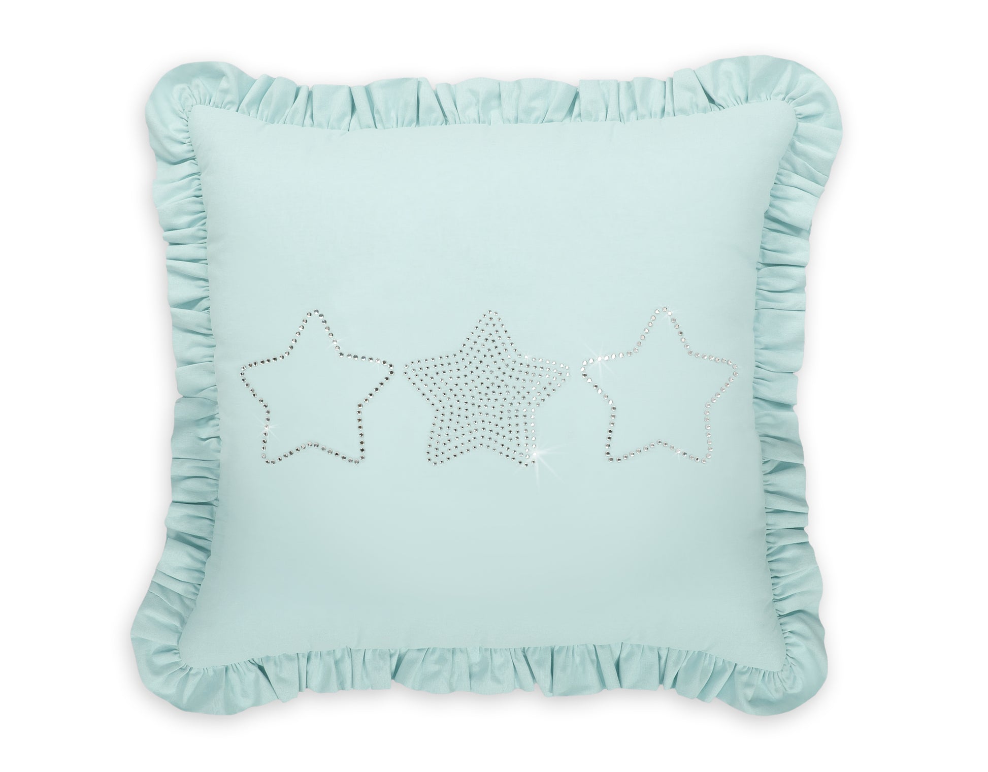 Elegant kudde med en slående applikation och en elegant volang. Kuddfodralet är tillverkat av mjuk bomull och prydt med en skimrande applikation av fin zirkonia, vilket gör det till ett snyggt blickfång.