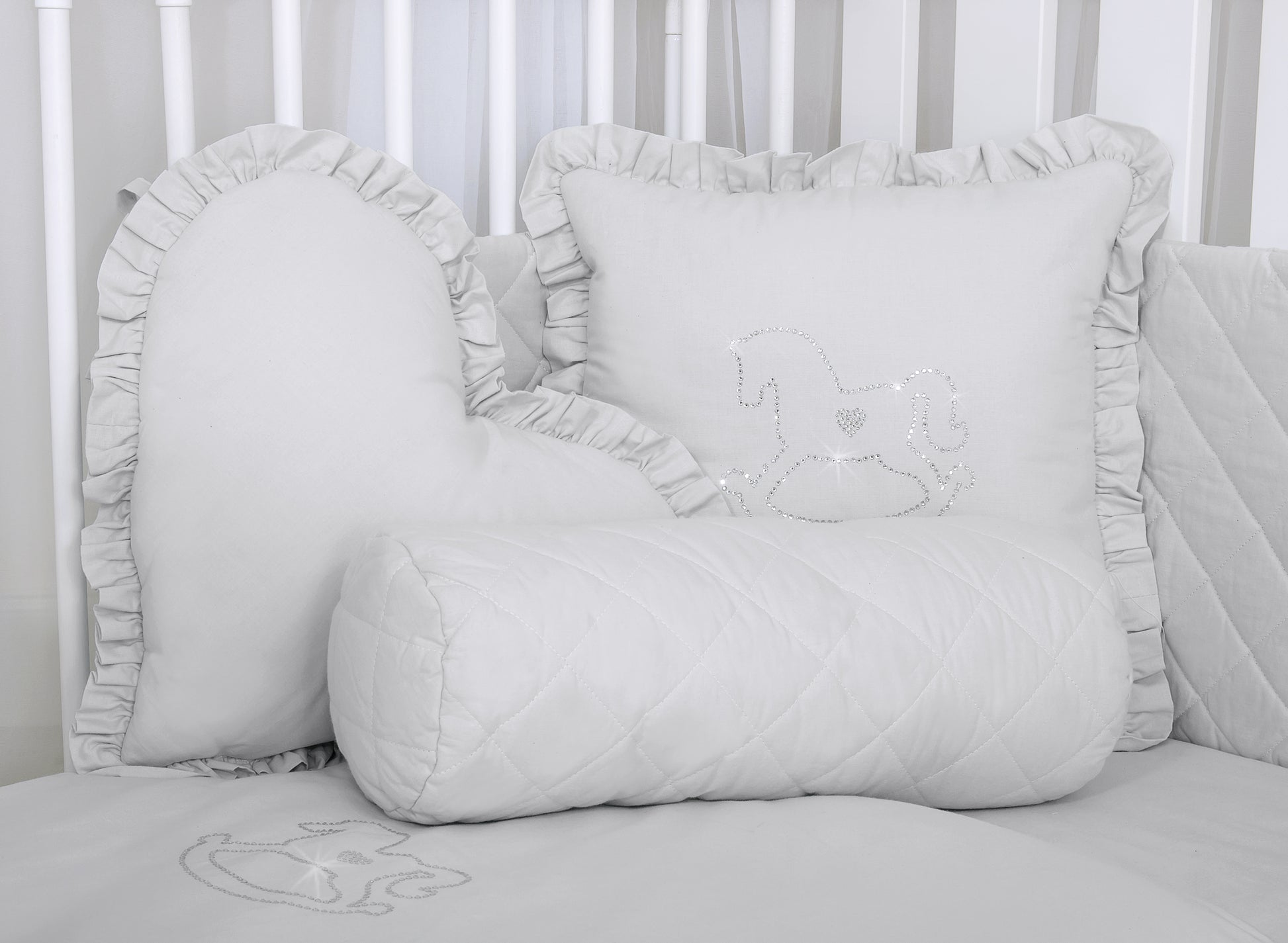 Elegant quiltad bälteskudde tillverkad av certifierat bomullstyg. Det icke-avtagbara ytterlagret är fyllt med Eco Fillball Silicone Balls – ett artificiellt dun som ger utmärkt stöd och luftcirkulation, perfekt för bebisar. Denna bälteskudde är perfekt som en snygg dekoration i barnrummet och kompletterar våra sängkläder vackert.