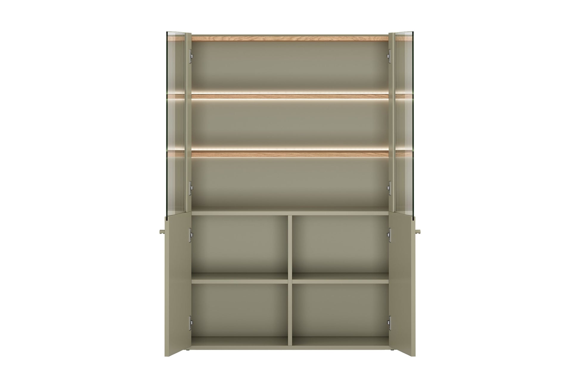 Geniet van overzichtelijke opbergruimte en stijlvolle presentatie met deze kast, geschikt voor bijvoorbeeld woonkamers of eetkamers. De kast integreert moeiteloos in moderne, Scandinavische of Japandi interieurs en combineert mooi met lichte wanden en houten vloeren. Dankzij de stalen scharnieren met zachte sluiting openen en sluiten de deuren geruisloos, terwijl ABS-randen extra bescherming bieden. De LED-verlichting zorgt voor een warme sfeer en accentueert uw accessoires en decoraties.