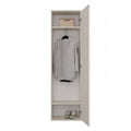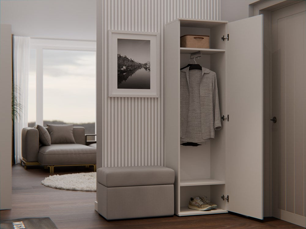 De kast “DUO” biedt diverse voordelen: hij is voorzien van twee ruime planken en een handige kledinghanger, waardoor je moeiteloos kleding en accessoires ordent. De geïntegreerde spiegeldeur vergroot optisch de ruimte en voegt een vleugje luxe toe. Dankzij de universele installatie kun je de deur zowel links als rechts monteren. Dit meubelstuk is eenvoudig zelf te monteren en kan worden uitgebreid met extra modules. De afwerking met ABS-kunststof biedt duurzaamheid en onderhoudsgemak, waardoor de kast geschikt is voor intensief dagelijks gebruik.