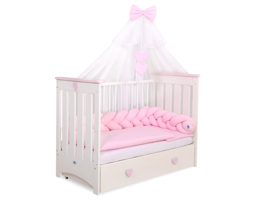 En vacker, extra mjuk flätad spjälsängsskydd, tillverkad av 100 % bomull. Spjälsängen fästs enkelt på ribbor.