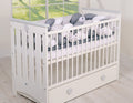 En vacker, extra mjuk vävd spjälskyddsskydd tillverkad av 100 % bomull. Detta skydd fästs enkelt på spjälsängsstängerna och skyddar ditt barns små händer och fötter från att klämmas. Det förhindrar också att huvudet och kroppen stöter mot spjälsängens väggar.