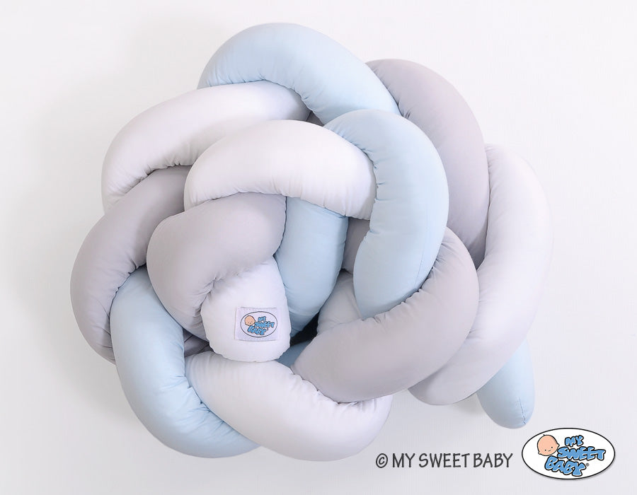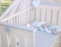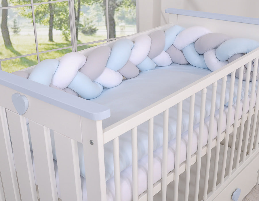 Flätad spjälsängsskydd, knutskydd, säkert skydd - 100% bomull, vit-grå-blå