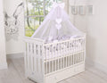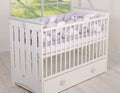 Denna vackra, extra mjuka flätade spjälskydd är tillverkad av 100 % bomull . Den fästs enkelt på spjälsängsstängerna med de medföljande bomullsrosetterna.