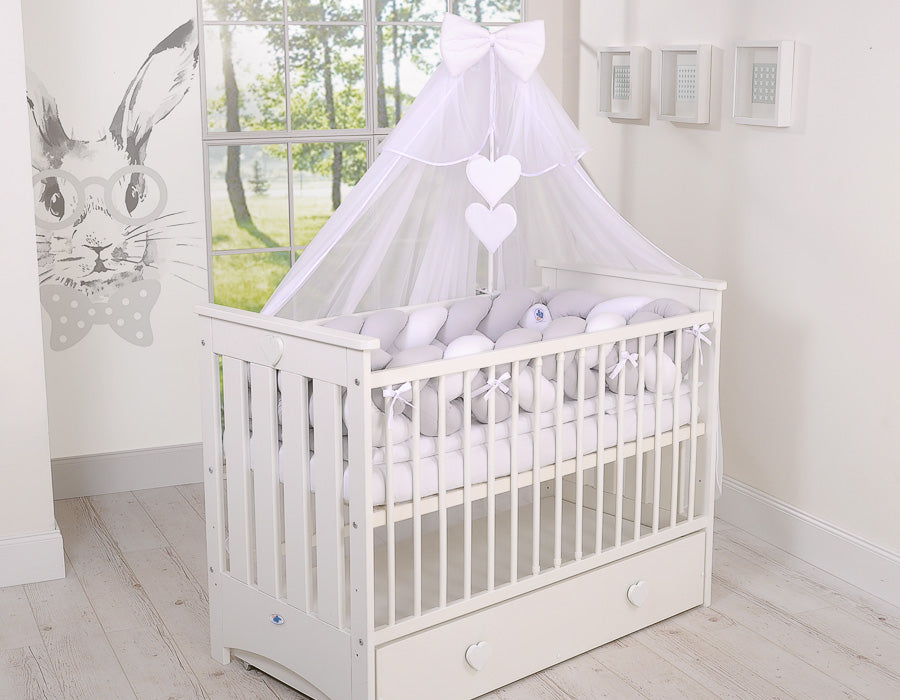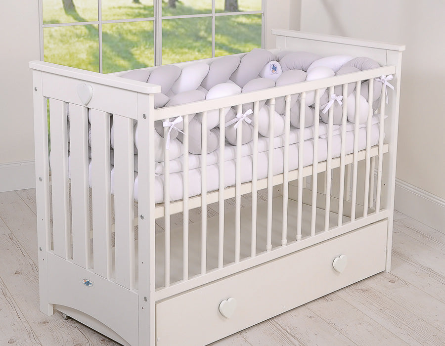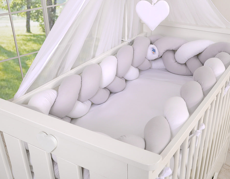 I paketet: 1 flätad spjälsängsskydd, bomullsrosetter för fastsättning