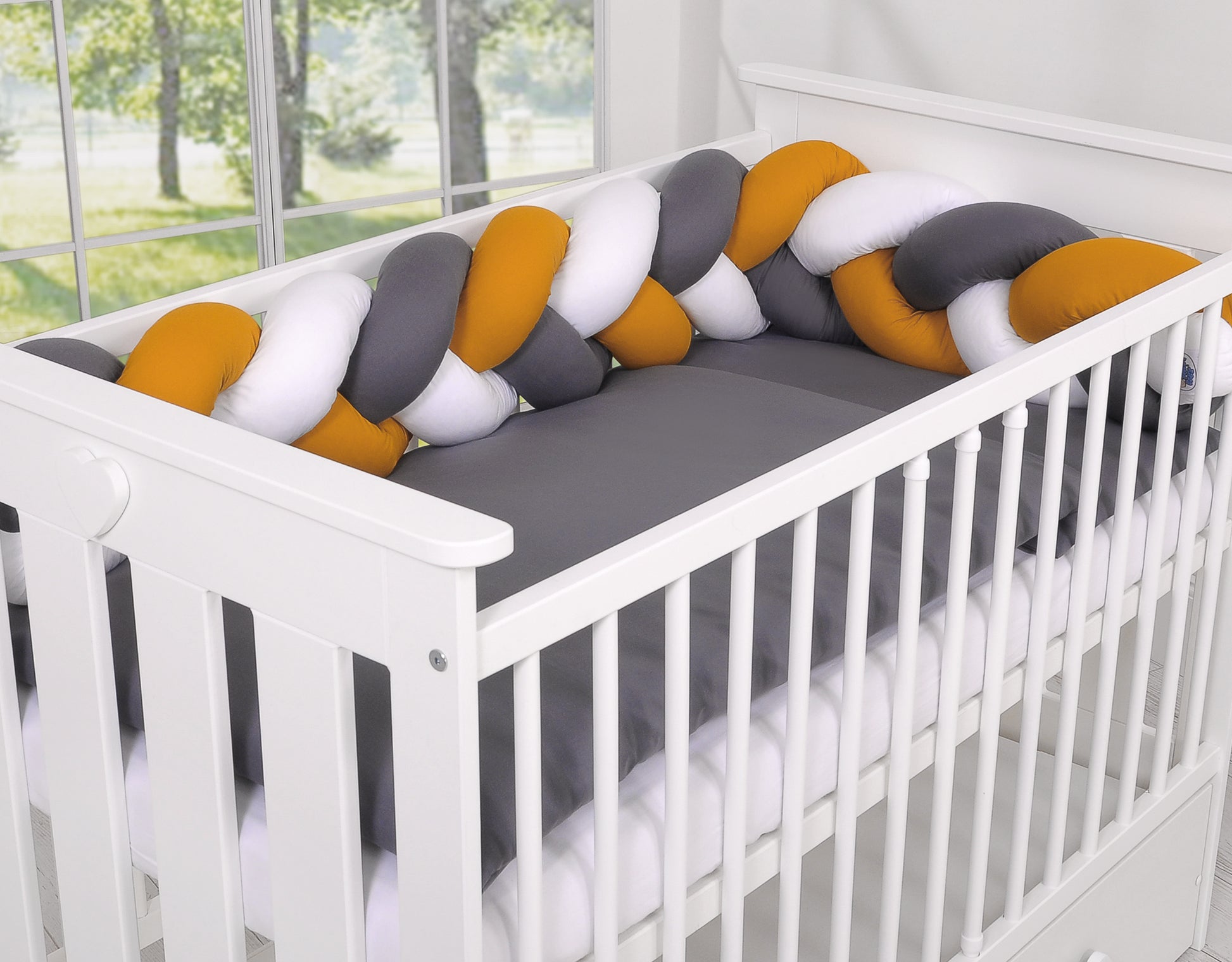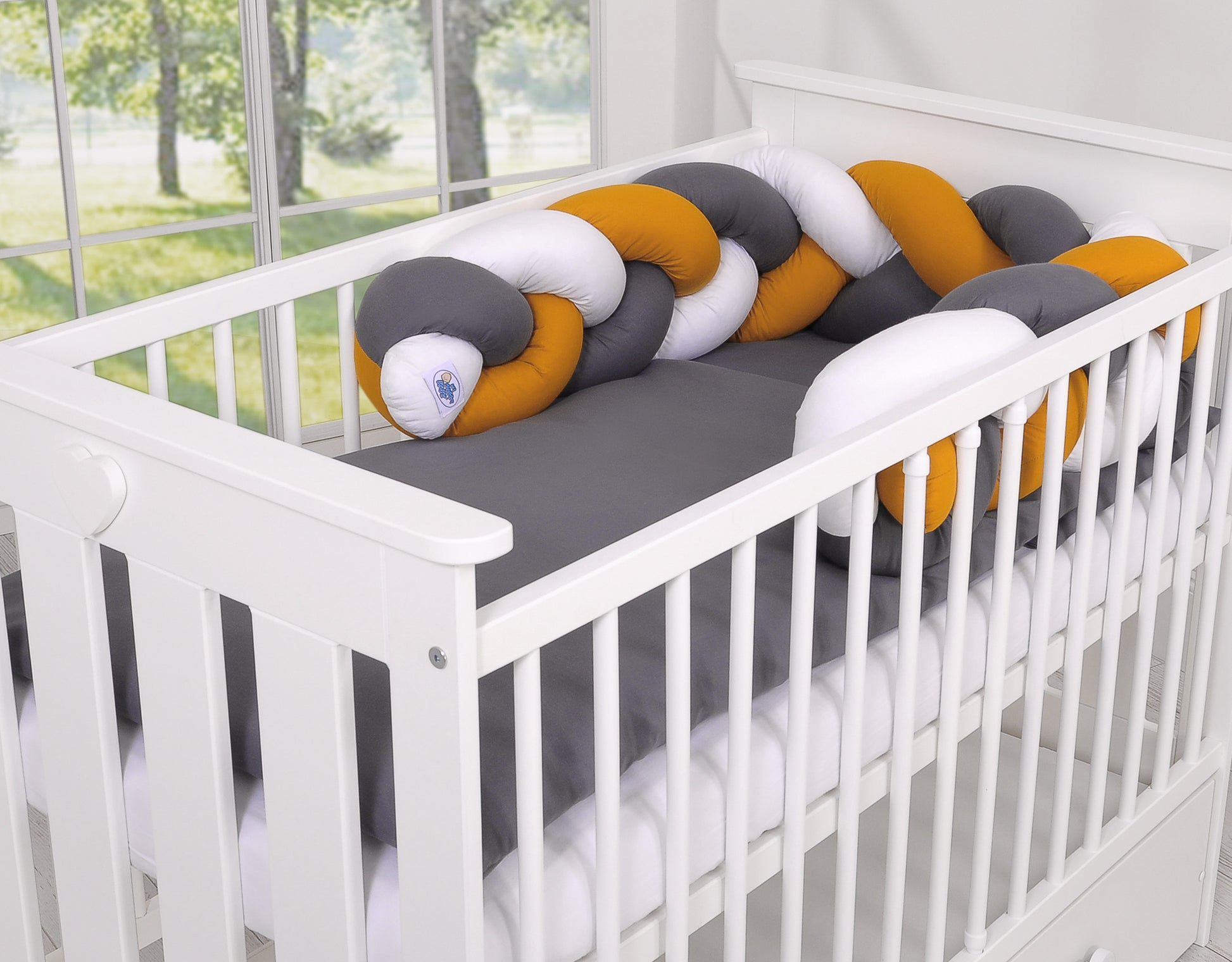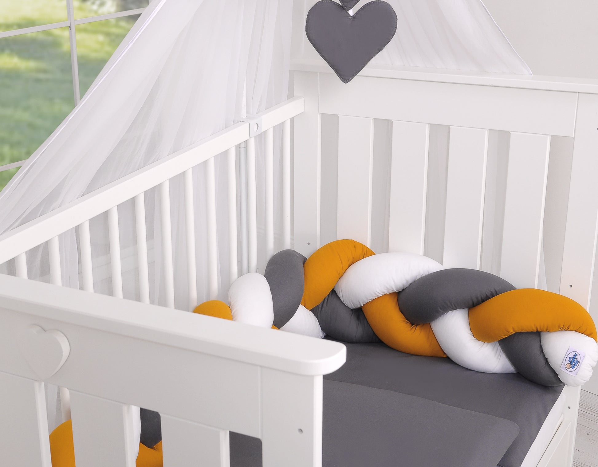 Denna vackra, extra mjuka flätade spjälskydd är tillverkad av 100 % bomull. De medföljande bomullsrosetterna gör den enkel att fästa på spjälskyddet. Spjälskyddet skyddar ditt barns händer och fötter från att klämmas mellan spjälskyddet och förhindrar att huvud och kropp stöter mot spjälskyddets väggar.