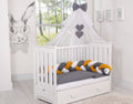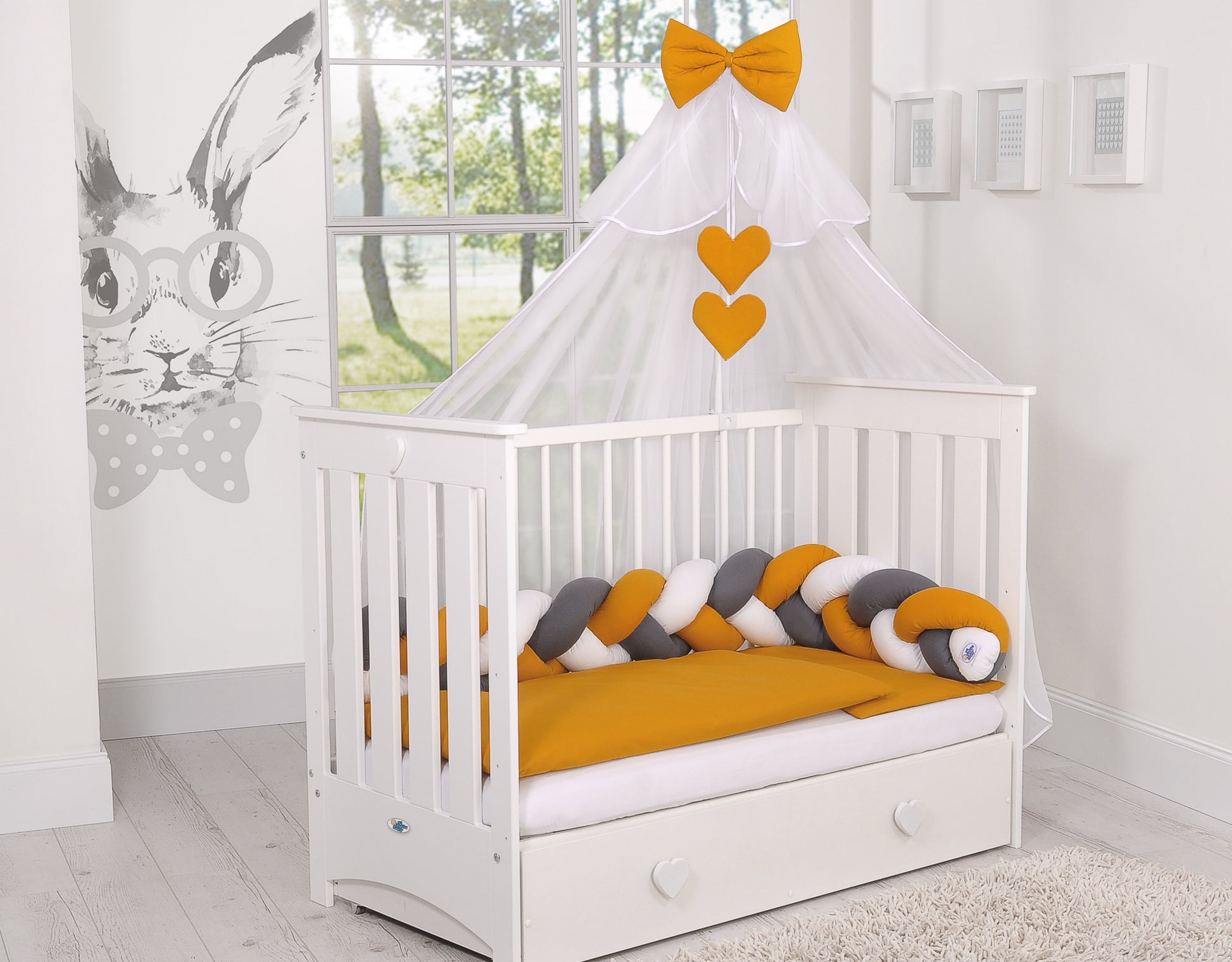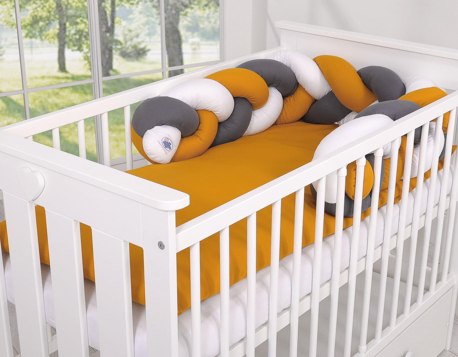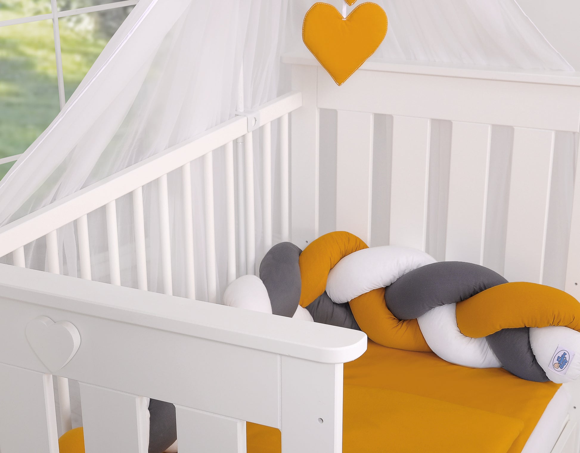 Denna vackra, extra mjuka flätade spjälskydd är tillverkad av 100 % bomull. De medföljande bomullsrosetterna gör den enkel att fästa på spjälskyddet. Spjälskyddet skyddar ditt barns händer och fötter från att klämmas mellan spjälskyddet och förhindrar att huvud och kropp stöter mot spjälskyddets väggar.