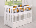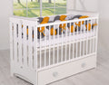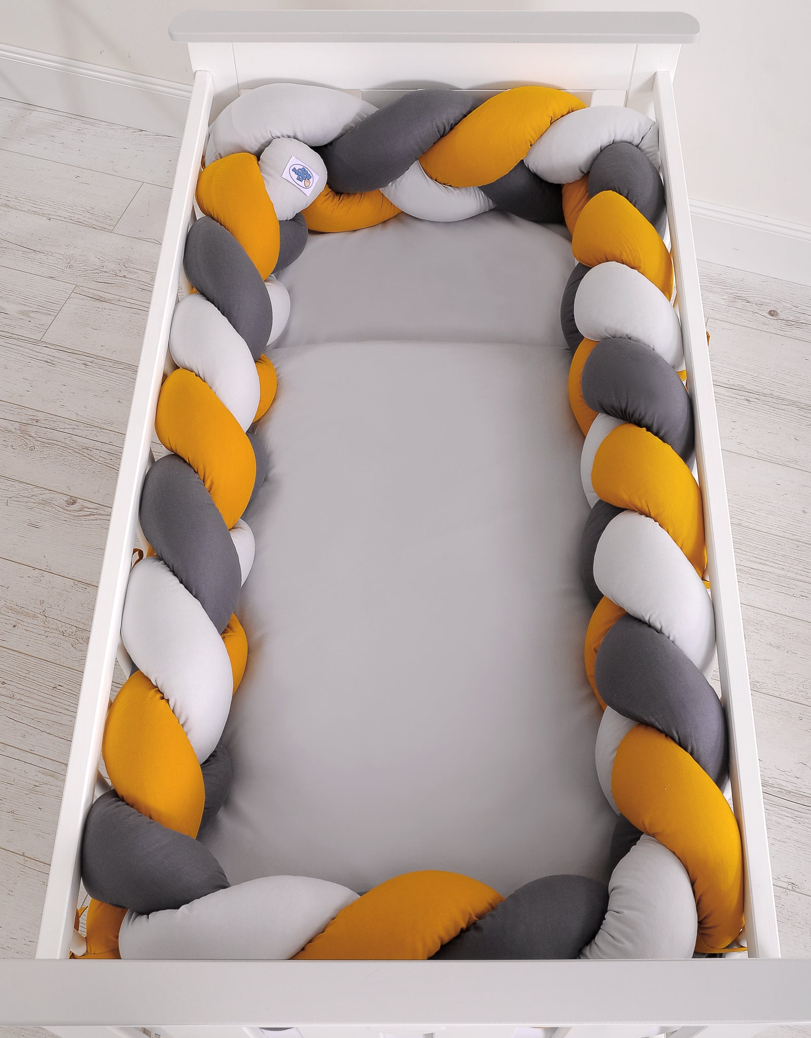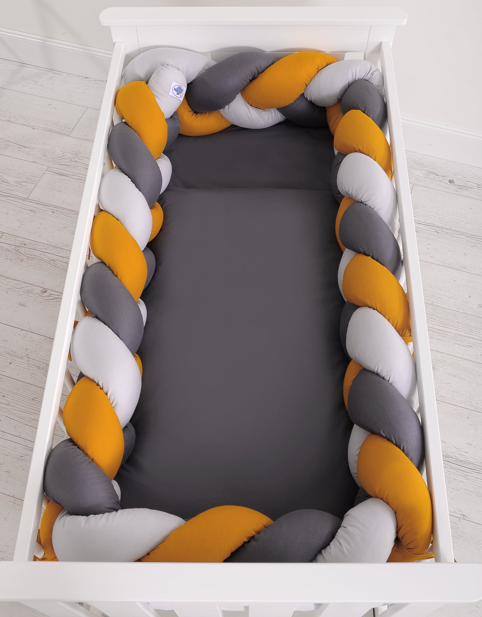 En vacker, ultramjuk vävd spjälskyddsskydd, tillverkad av 100 % bomull. Detta skyddsskydd erbjuder optimalt skydd genom att förhindra att ditt barns händer och fötter fastnar mellan spjälsängarna. Det skyddar också ditt barns huvud och kropp från att stöta in i spjälsängens väggar.