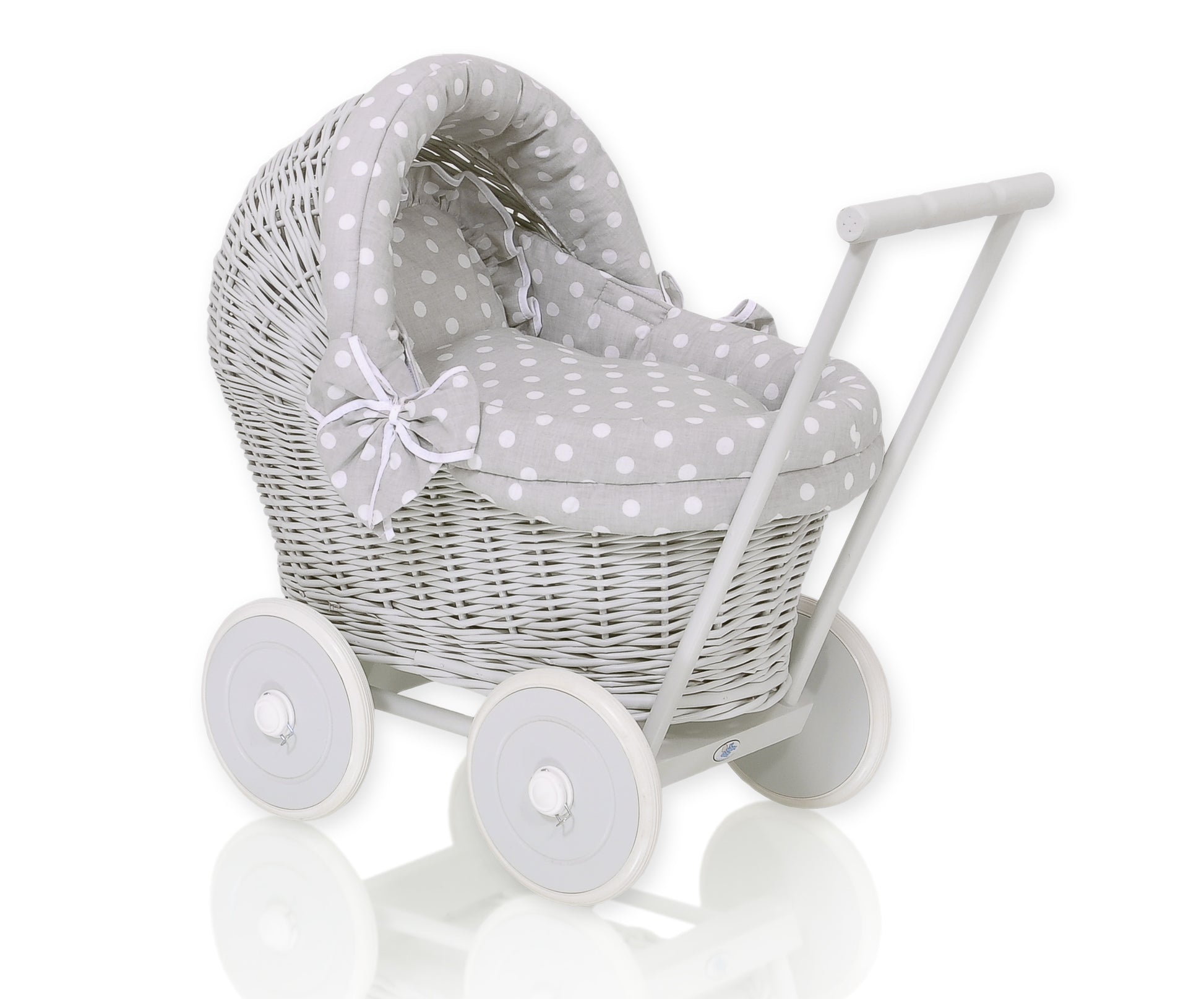 Denna snygga dockvagn är handgjord av naturlig rotting och har ett robust trächassi med trähjul, vackert målade grå. Det är den perfekta presenten till små flickor som älskar att leka med riktiga, högkvalitativa accessoarer.
