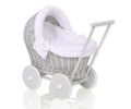 Grå rotting dockvagn – barnvagn – med vita sängkläder och mjuk vaddering för komfort