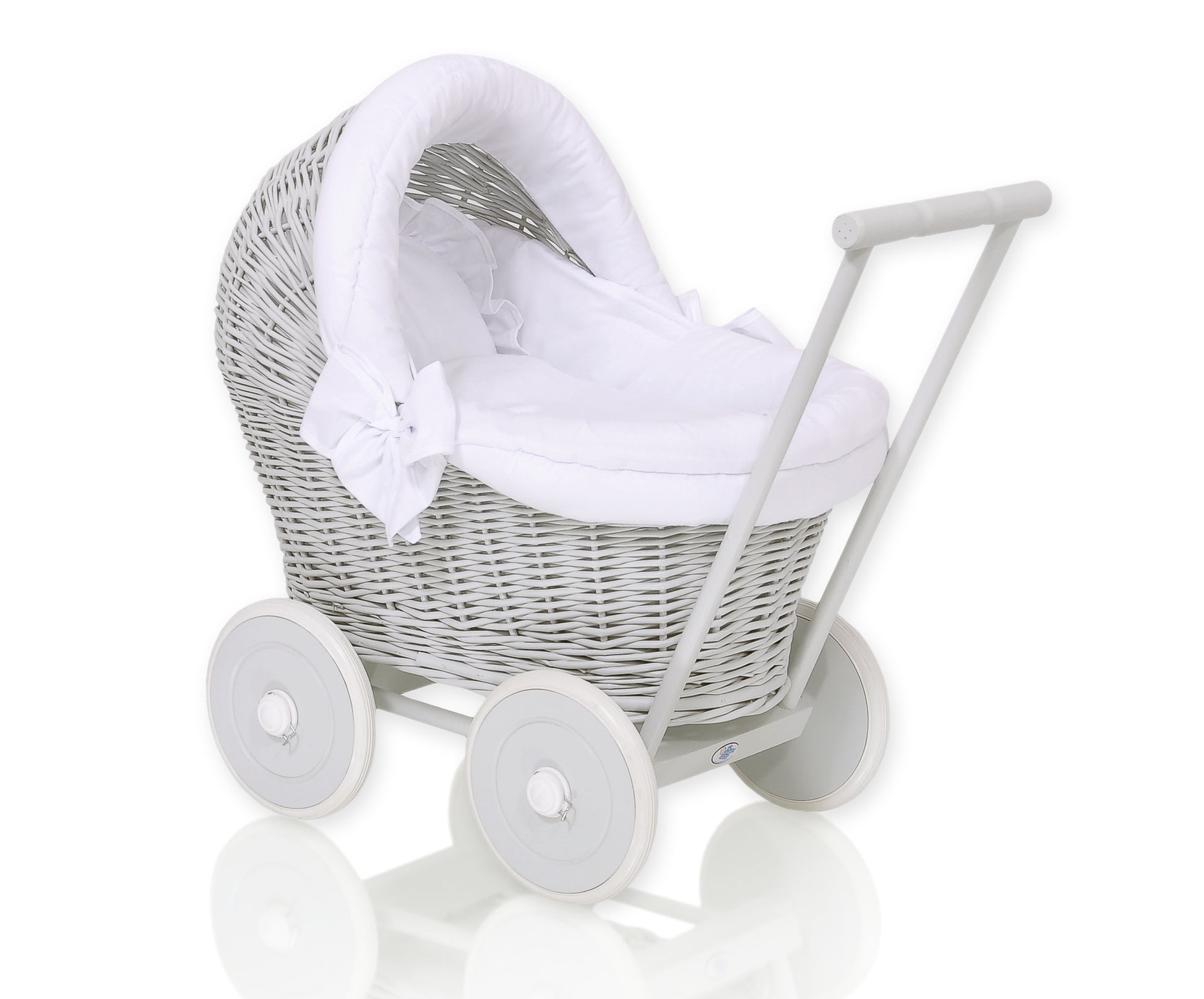 Denna vackra dockvagn är tillverkad av naturlig polsk rotting, handvävd och miljövänlig. Den står på ett robust chassi i bokträ, med trähjul försedda med gummidäck för optimalt grepp och skydd. Vagnen är målad grå och har eleganta, stora rosetter för ett snyggt och unikt utseende.