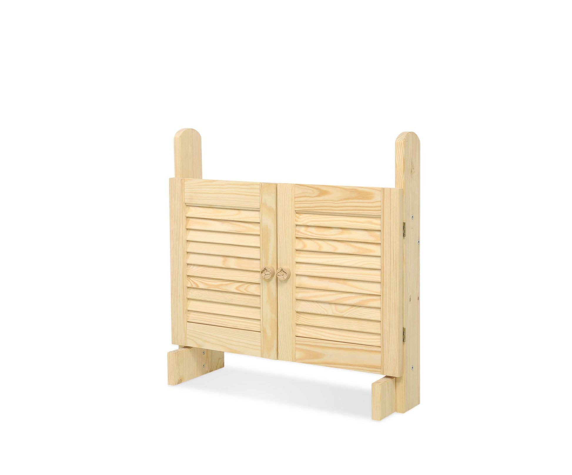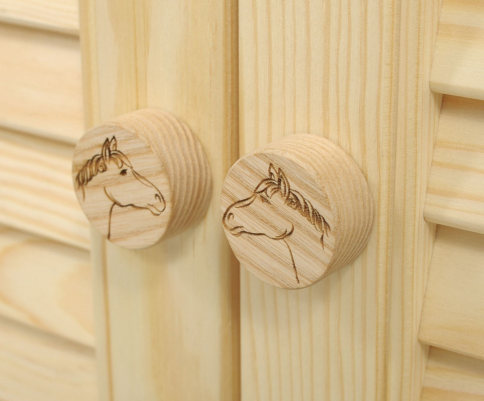 - Trädörrar med genombrutna galler och handgjorda hästhuvuden i trä som handtag