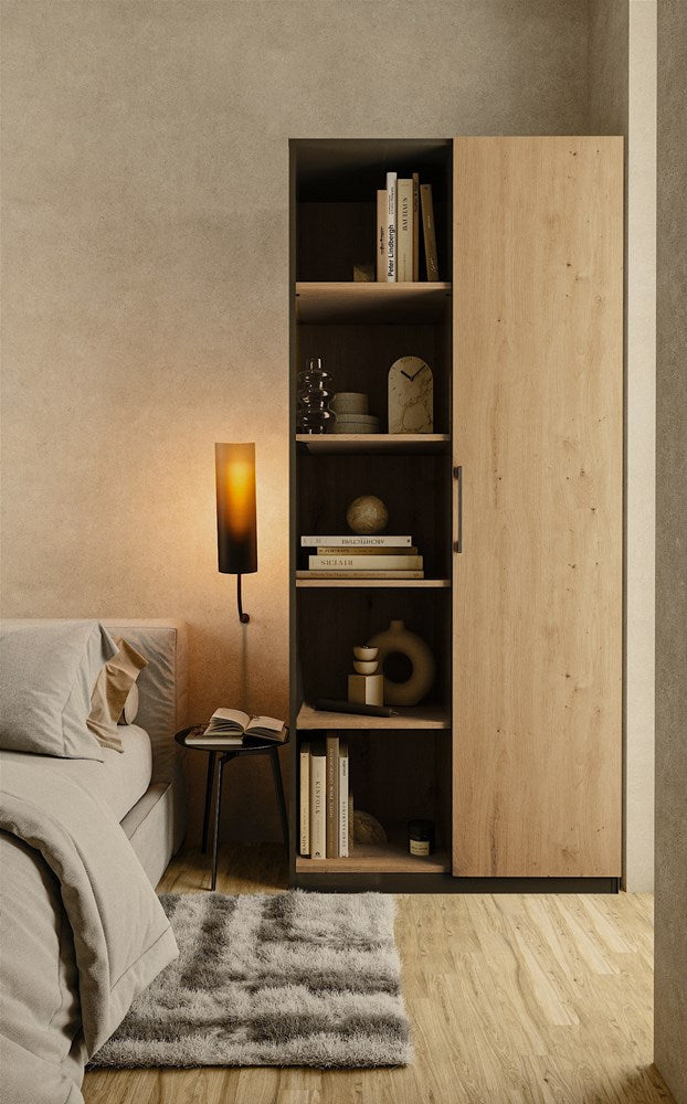De RD-80 halfopen boekenkast combineert een modern, minimalistisch ontwerp met praktische functionaliteit. Deze stijlvolle kast is uitgevoerd in de kleuren antraciet en artisan eiken, en beschikt over 10 royale planken, waarvan enkele achter een deur zijn verborgen. Gemaakt van stevige, 16 mm dik gelamineerde spaanplaat, biedt deze boekenkast ruimte voor boeken, decoraties en meer. Perfect voor in de woonkamer, op kantoor of in de studeerkamer. Poolse kwaliteit garandeert duurzaamheid en een nette afwerking die lang mooi blijft.