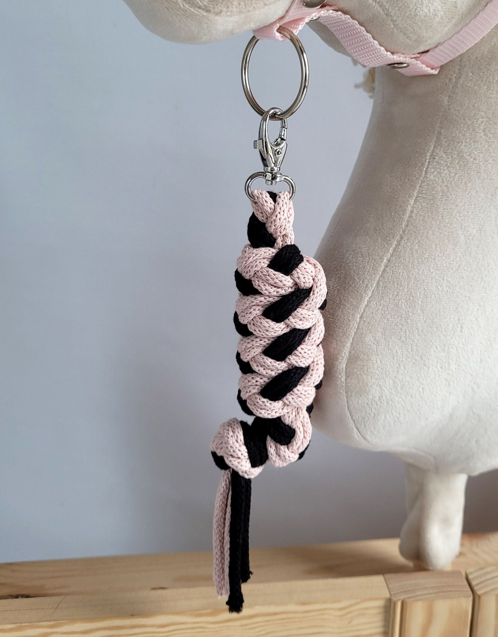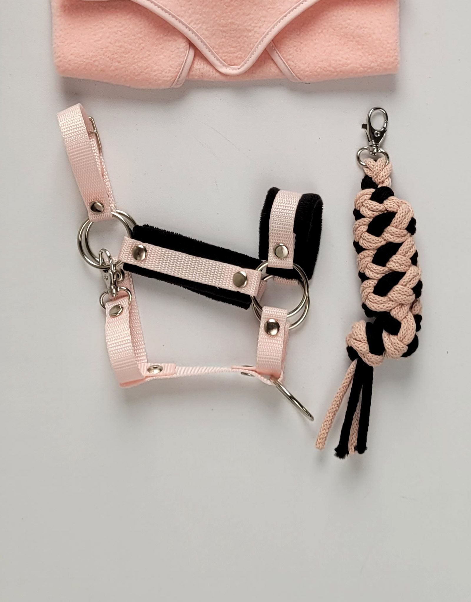 Käpphästset: Grimma A3 med svart päls + dubbelflätat koppel – svart-puderrosa