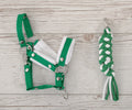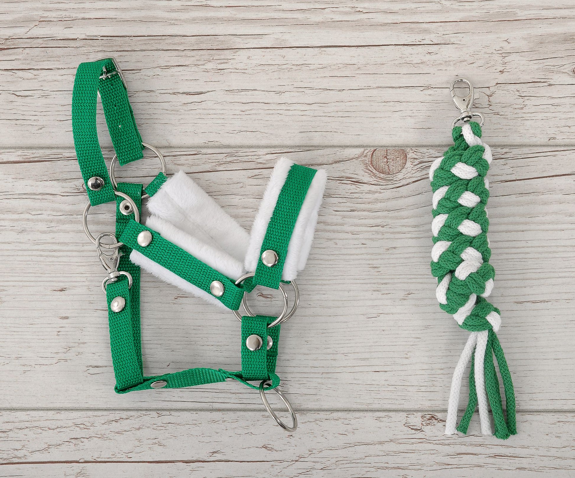 Grimmaset, hästgrimma, justerbar och mjuk päls, med handgjort koppel, vitgrön