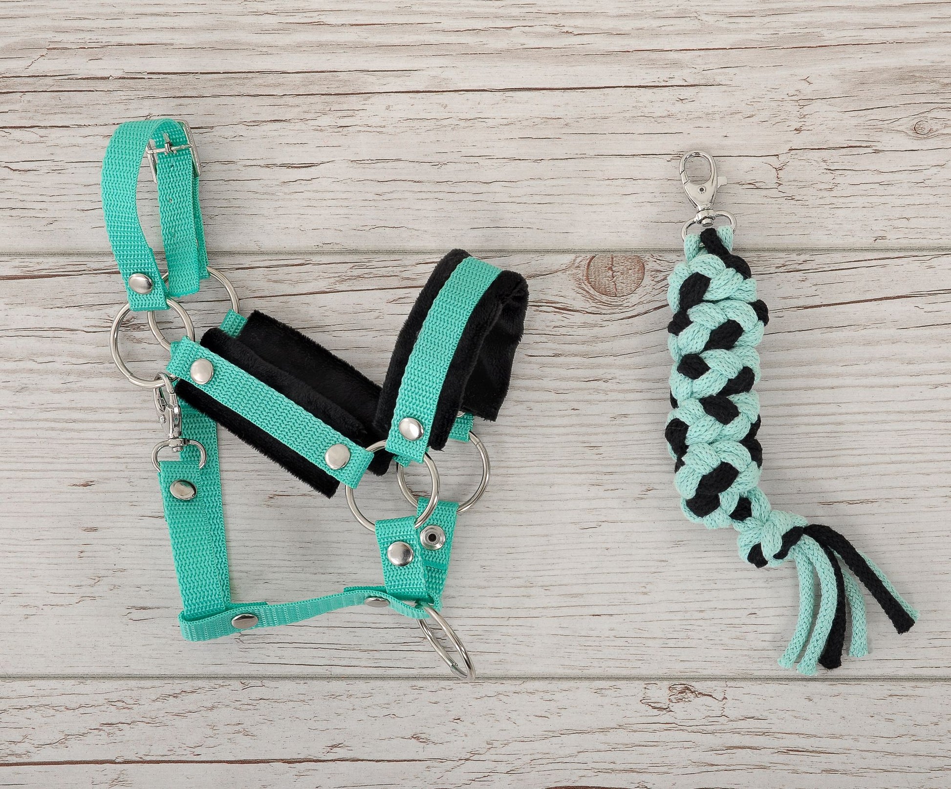 Grimmaset för hobbyhäst - hästgrimma - justerbart och allergivänligt rep, svart-mint