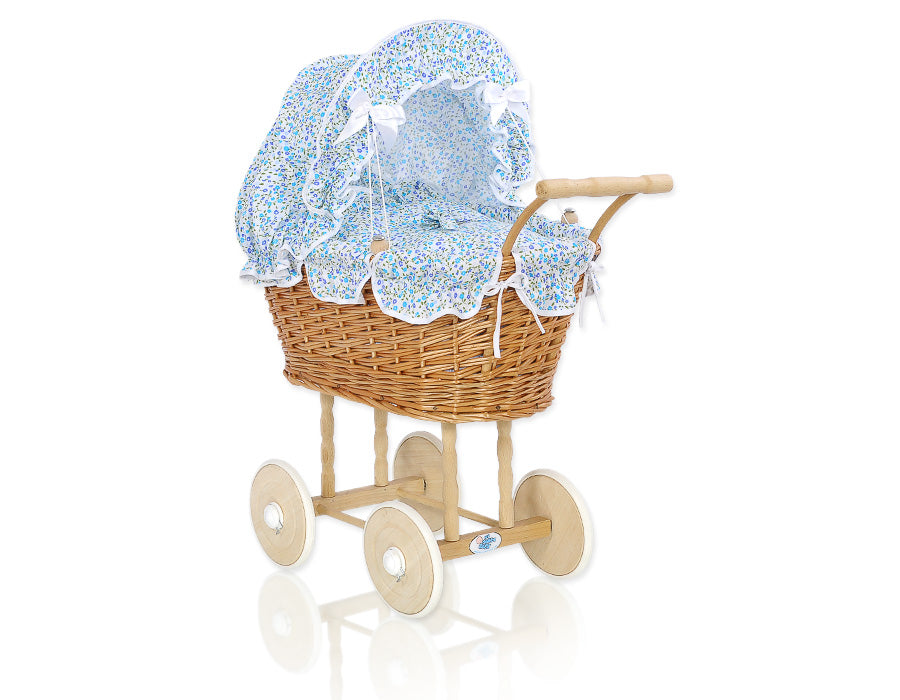 Handgjord dockvagn i rotting - rottingvagn - slitstark och stabil med blå klädsel
