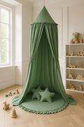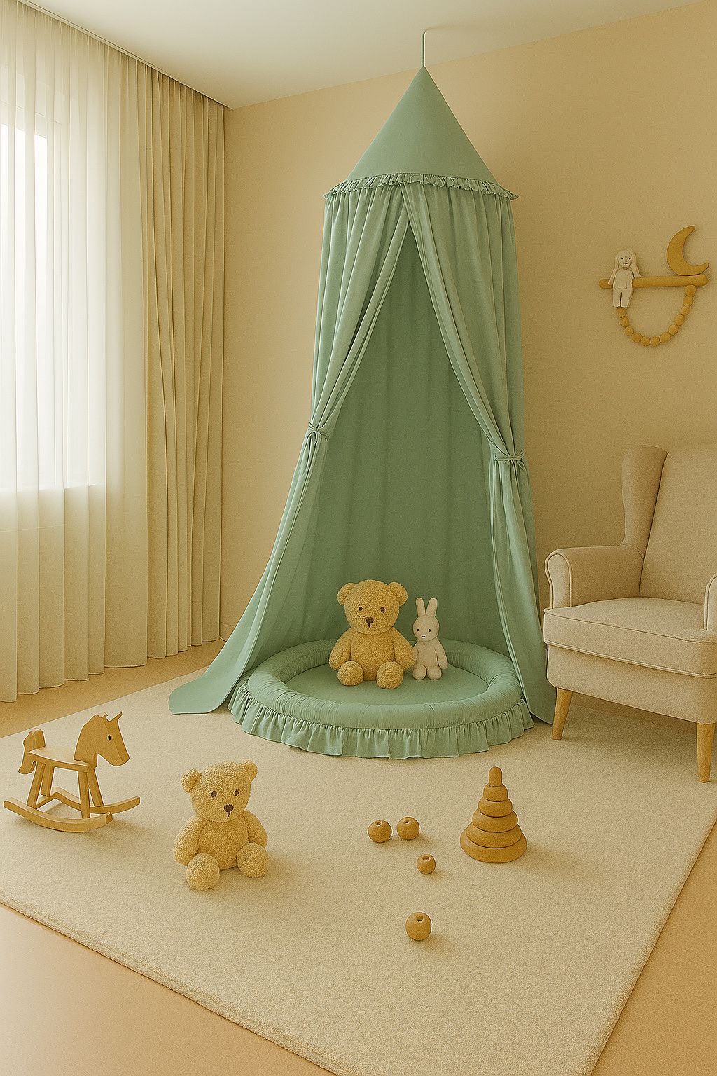 Hängande himmelsäng – bomullshimlad – säkerhets- och lekyta för barnrum, pastellgrön