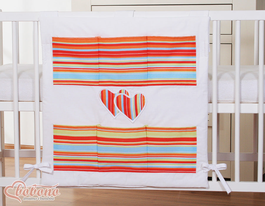 Praktisk spjälsängsorganisatör med färgglada orangea remsor, perfekt för förvaring av leksaker, blöjor, våtservetter, nappar eller andra nödvändigheter för bebisen. Ge din barnvagn eller spjälsäng en lekfull och organiserad touch.