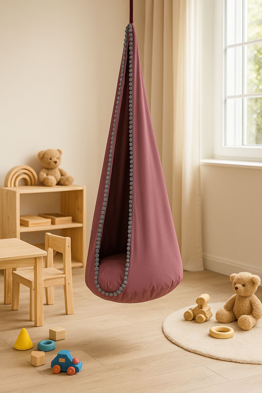 BellaFurn Baby Hängande Hängmatta Cocoon erbjuder en bekväm sittplats och en trevlig avkopplingsyta för alla barn. Perfekt för användning hemma, i trädgården eller på uteplatsen. Tillverkad av högkvalitativa material, har en robust konstruktion och noggrant hantverk för optimal säkerhet.
