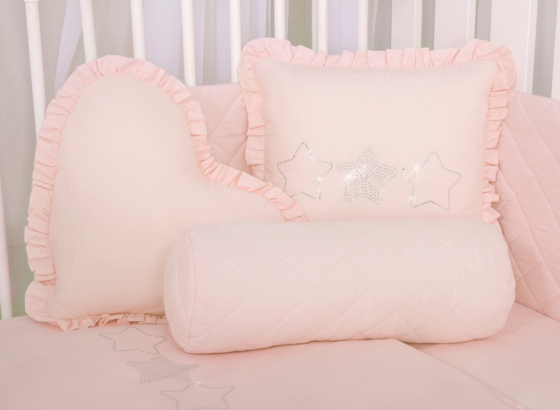 Elegant hjärtformad kudde med volanger, perfekt som en mysig dekoration i alla barnrum. Kudden är tillverkad av 100 % bomull (med ett fast överdrag) och fylld med Eco Fillball – certifierade silikonbollar som ger bekvämt stöd och optimal luftcirkulation.