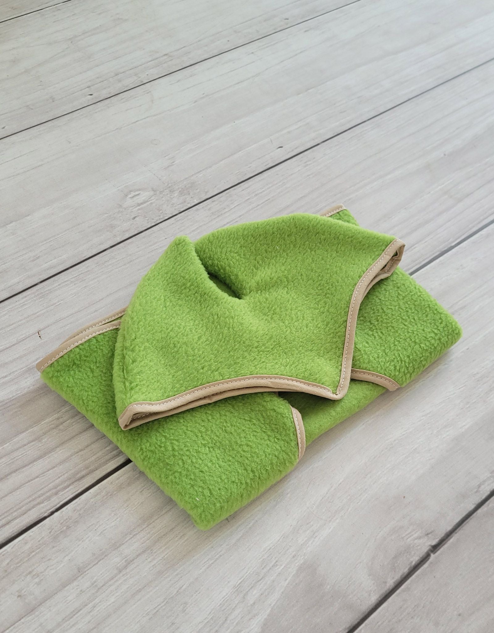 - Tillverkad av mjuk fleece med färgmatchade kantband