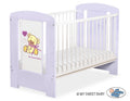 Träsäng 120x60 cm – barnsäng – justerbar botten, säkerhetsstänger, lila nallebjörn