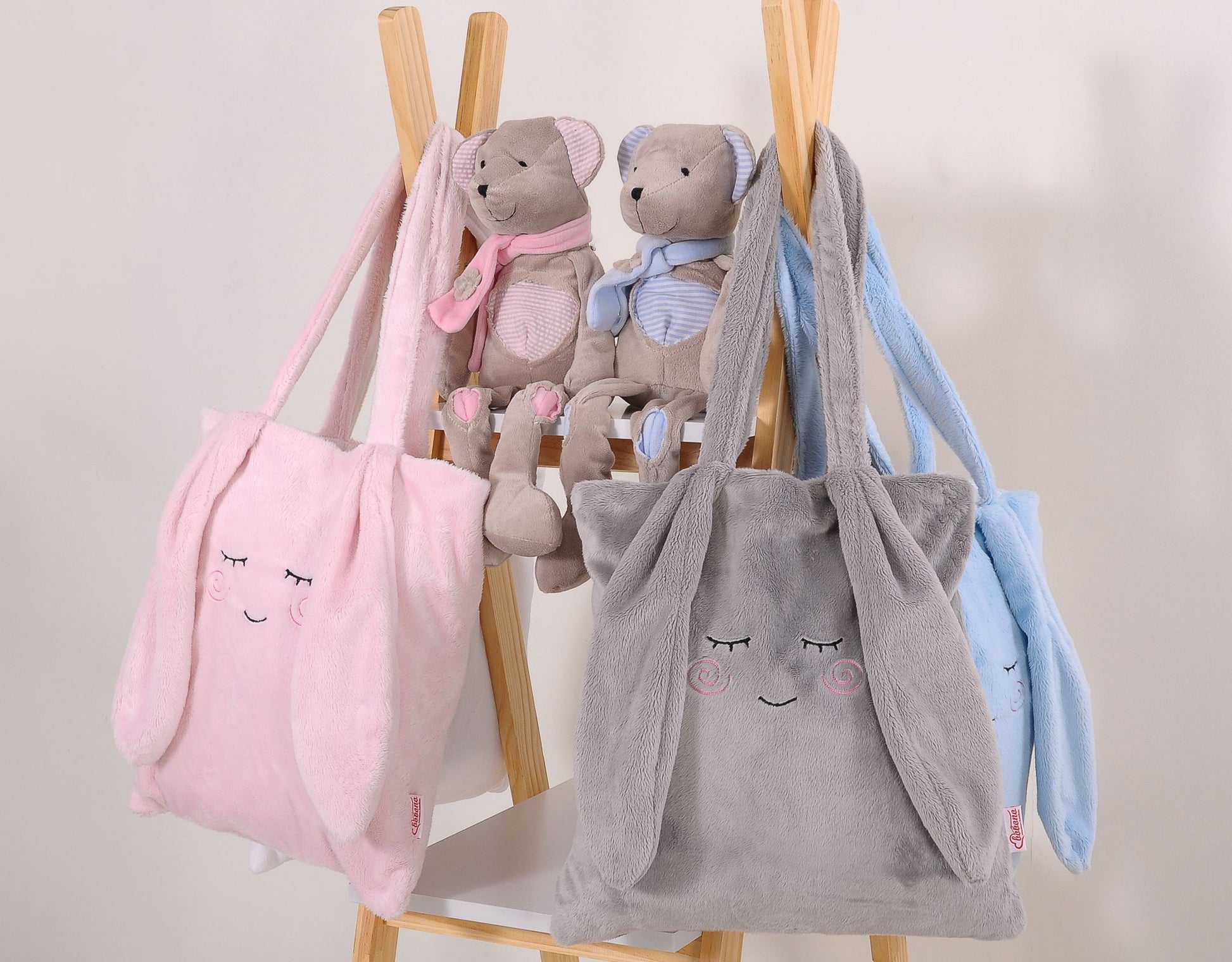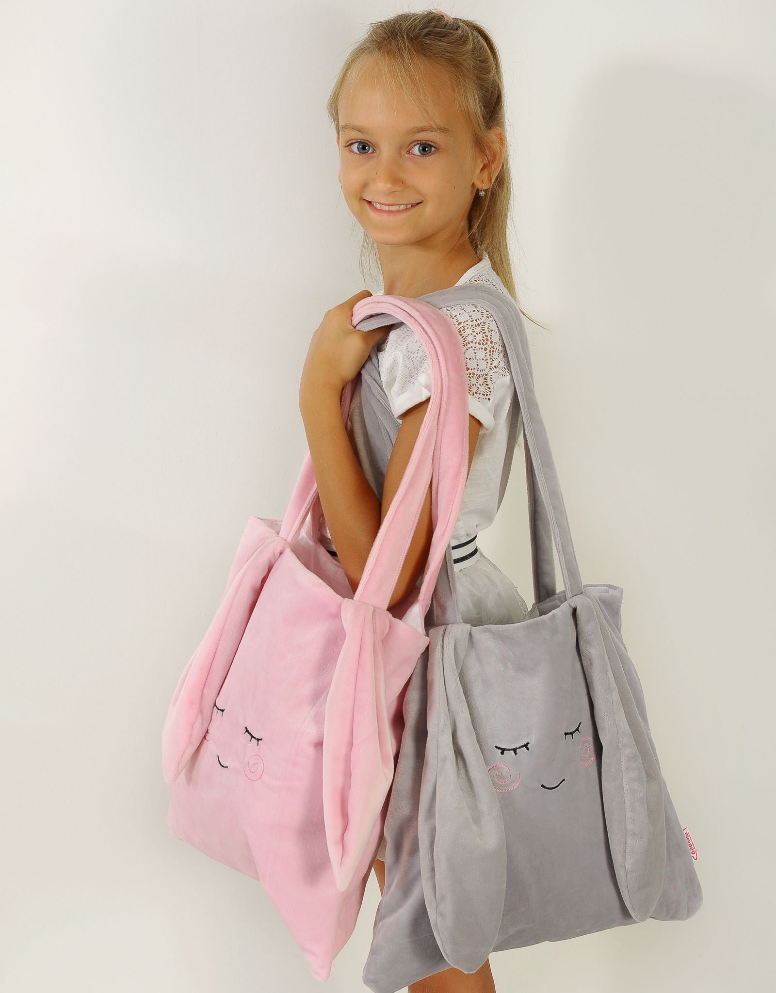 En söt och mjuk barnväska med långa kaninöron. Tillverkad av mjukt minktyg med bomullsfoder för extra komfort och hållbarhet. Perfekt för vardagliga äventyr eller lek.