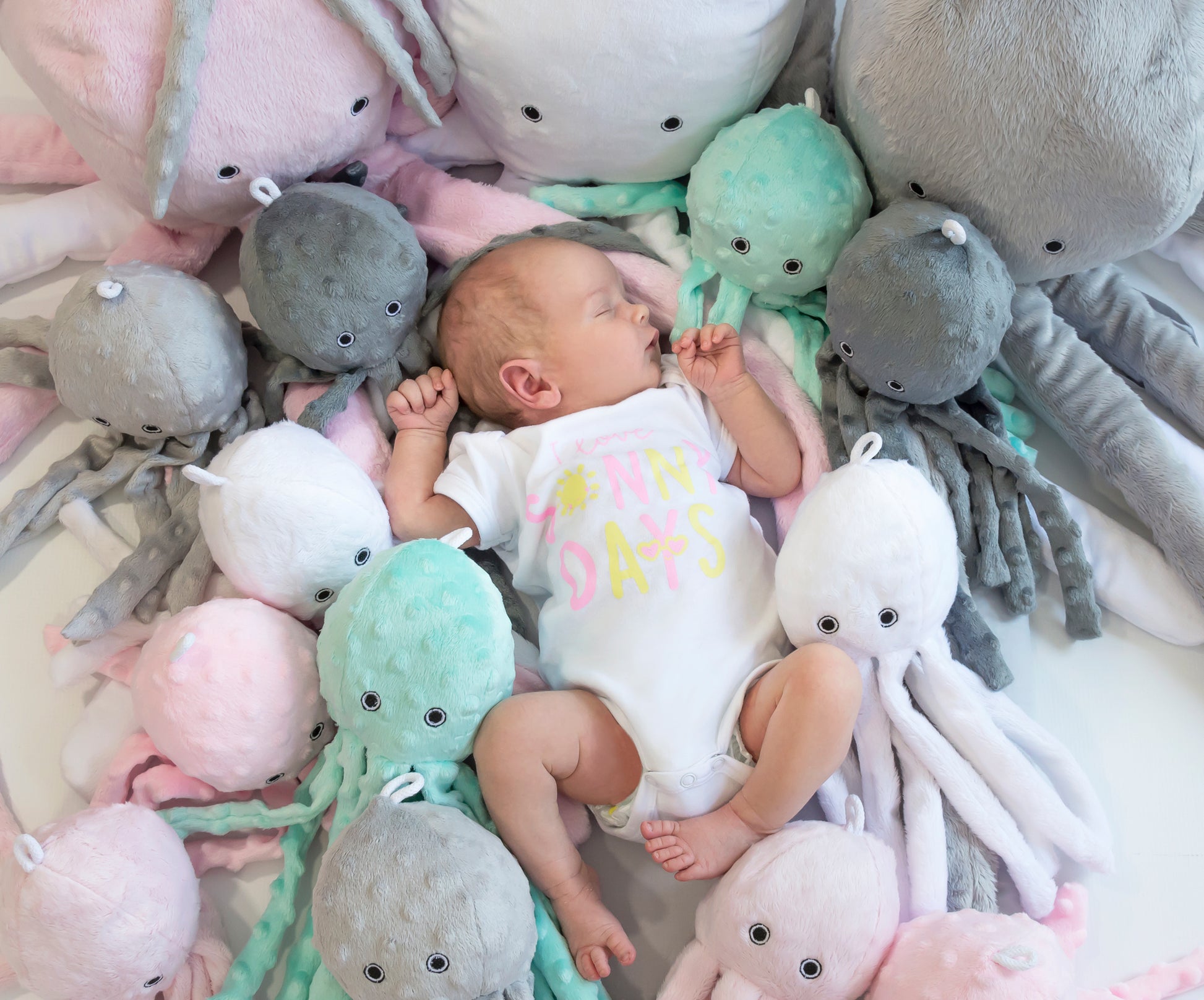 Denna roliga gosiga bläckfisk är perfekt för att sova och gosa med för alla bebisar. Bläckfiskens armar är perfekta för små händer att hålla i. Den är säker och lämplig från de allra första dagarna i livet.