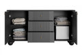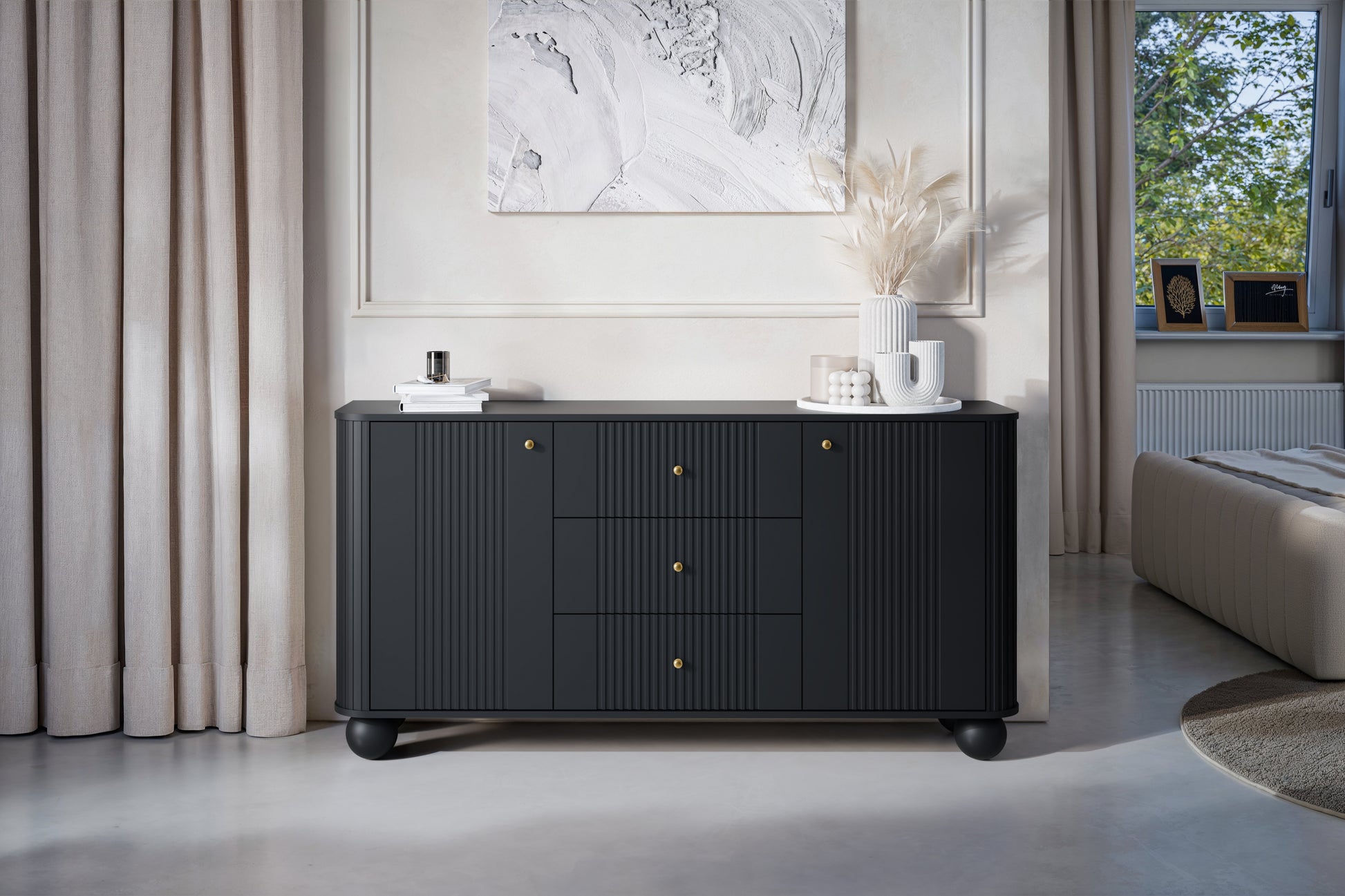 De Vesper ladekast 160 cm combineert elegantie met functionaliteit. Deze blikvanger in matzwart is voorzien van gouden handgrepen en luxueuze, bolvormige poten van massief hout. De gegroefde MDF-fronten creëren een unieke diepte en verfijnde uitstraling. Met een robuuste constructie van 16 mm dik MDF en gelamineerd karton is deze kast bestand tegen dagelijks gebruik. Drie ruime lades en twee kasten bieden volop opbergruimte, terwijl de ABS-randen de levensduur verlengen. Het dynamische lichtspel op het oppervlak zorgt ervoor dat deze kast schittert in elke woon- of eetkamer.