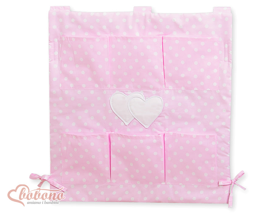 Snygg och praktisk spjälsängsmöbel från Hanging Hearts-kollektionen, med vita prickar på rosa bakgrund med en fin applikation.