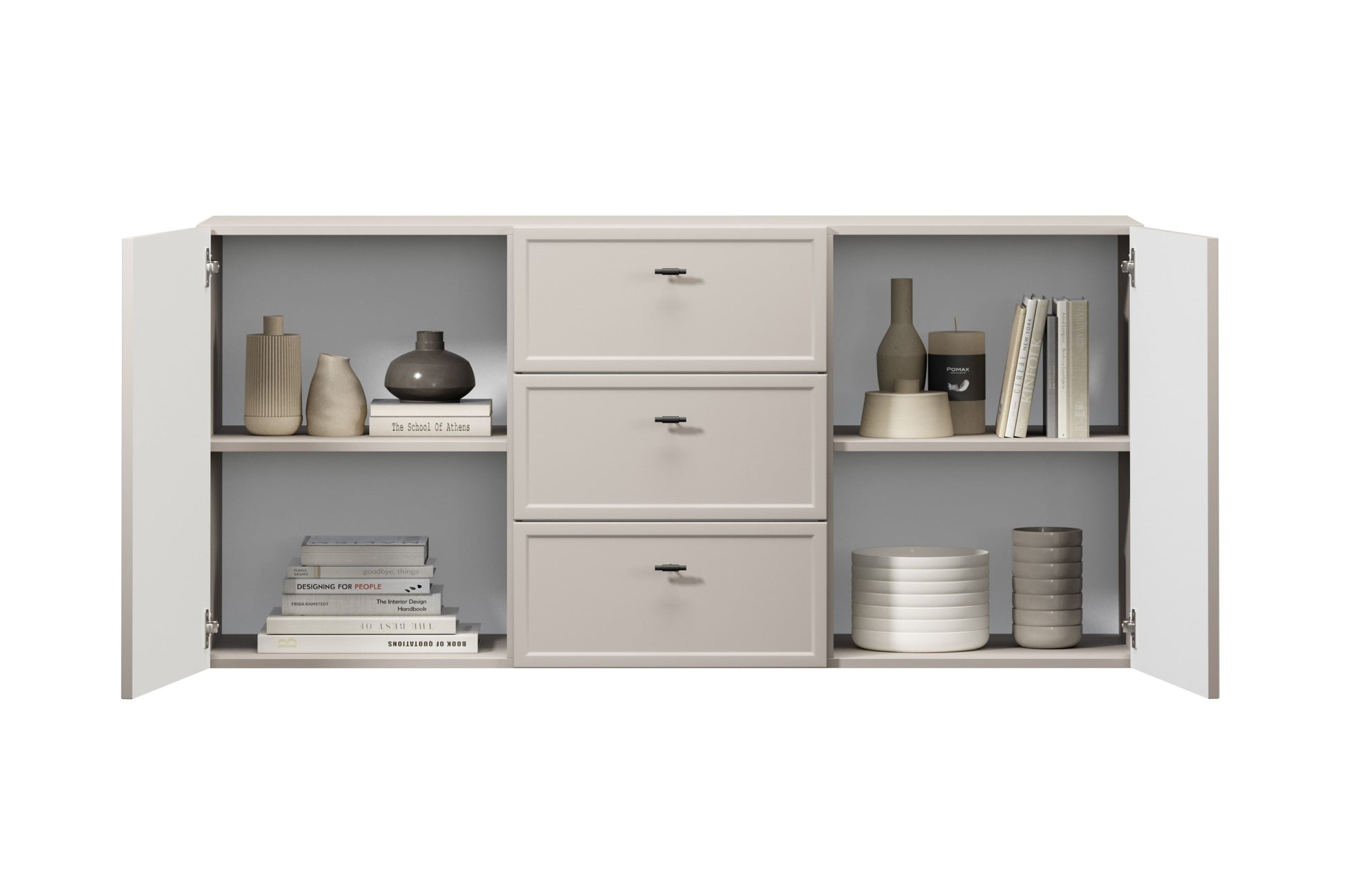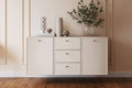 Profiteer van jarenlang gebruiksgemak dankzij duurzame materialen zoals 16 mm dikke melamineplaat en stevige 18 mm MDF-fronten. Het soft-close systeem van lades en deuren voorkomt hard dichtvallen en verhoogt het dagelijks comfort. Ideaal voor in de woonkamer, slaapkamer, eetkamer of kantoor; de neutrale kasjmierkleur laat zich eenvoudig combineren met zwart, wit, grijs of houttinten. De Lorini ladekast past perfect in moderne, industriële of Scandinavische interieurs en vergroot optisch elke ruimte.