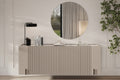 De Malmi hangende ladekast van 200 cm in kasjmier, crema bianca en zwart biedt een fraaie combinatie van design en functionaliteit. De geribbelde MDF-fronten in kasjmier en de bovenkant in crema bianca creëren een luxe uitstraling, terwijl de subtiel afgeronde randen en het ontbreken van zichtbare handgrepen zorgen voor een strak, minimalistisch karakter. Dankzij het slimme, pootloze ontwerp hang je deze kast op jouw gewenste hoogte, waardoor jouw interieur ruimer oogt en de opbergruimte optimaal wordt benut. Ideaal voor woonkamer, slaapkamer of kantoor!