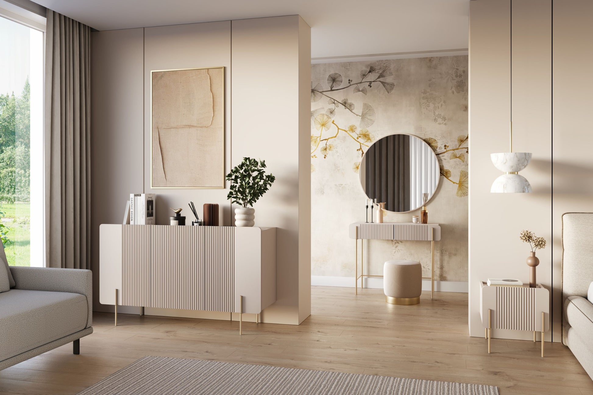 Ontdek het Malmi nachtkastje van 45 cm, een perfecte mix van elegantie en functionaliteit voor iedere slaapkamer. De combinatie van een mat kasjmier kast, een groef front zonder handgreep en goudkleurige, metalen poten geeft dit meubel een luxueuze uitstraling. Het afgeronde, gegroefde MDF-front en de minimalistische vormgeving zorgen voor een stijlvol, eigentijds accent. Dankzij hoogwaardige materialen, waaronder 16 mm gelamineerd karton en poedergecoate metalen poten, geniet u jarenlang van een duurzaam en chic nachtkastje.
