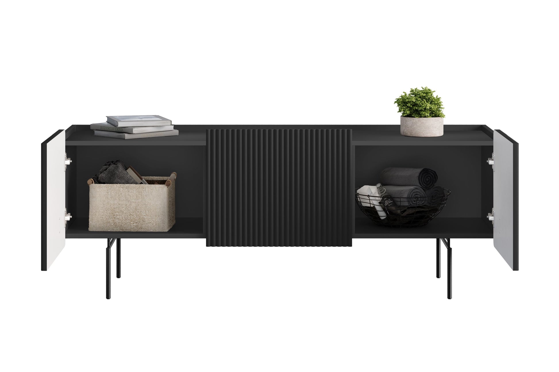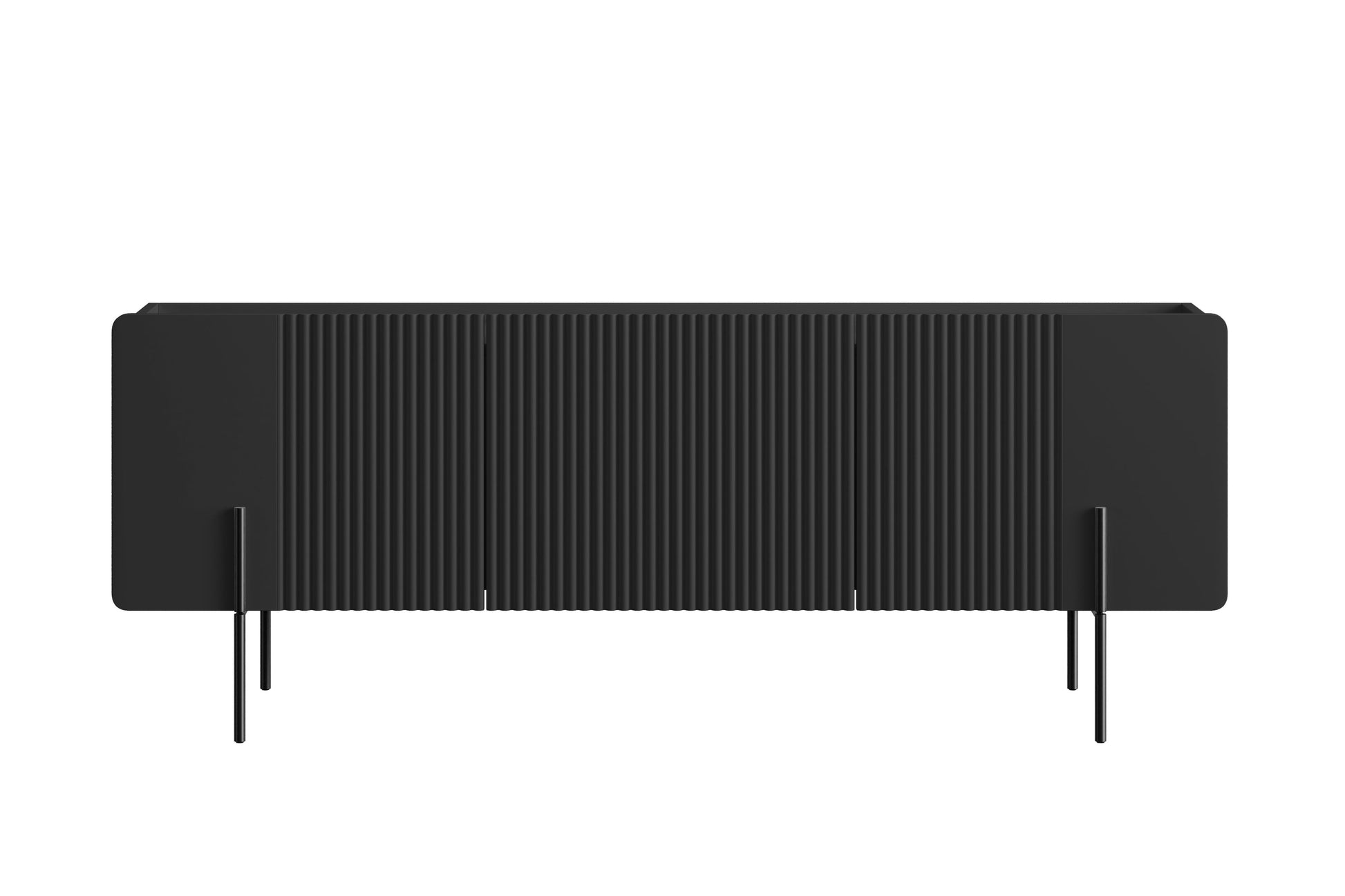 Ontdek het Malmi TV-meubel 150 cm in stijlvol matzwart met zwarte poten, het perfecte meubel voor een moderne woonkamer. Het minimalistische design wordt versterkt door opvallende geribbelde fronten, afgeronde randen en elegante, slanke metalen poten. Dit TV-meubel combineert functionaliteit met decoratieve waarde en past naadloos binnen trendy, moderne interieurs. De solide constructie van gelamineerd karton en duurzaam MDF zorgt voor stabiliteit en een lange levensduur, terwijl het matzwarte oppervlak een echte blikvanger is. Door het praktische ontwerp is er voldoende ruimte voor al uw multimedia apparatuur.