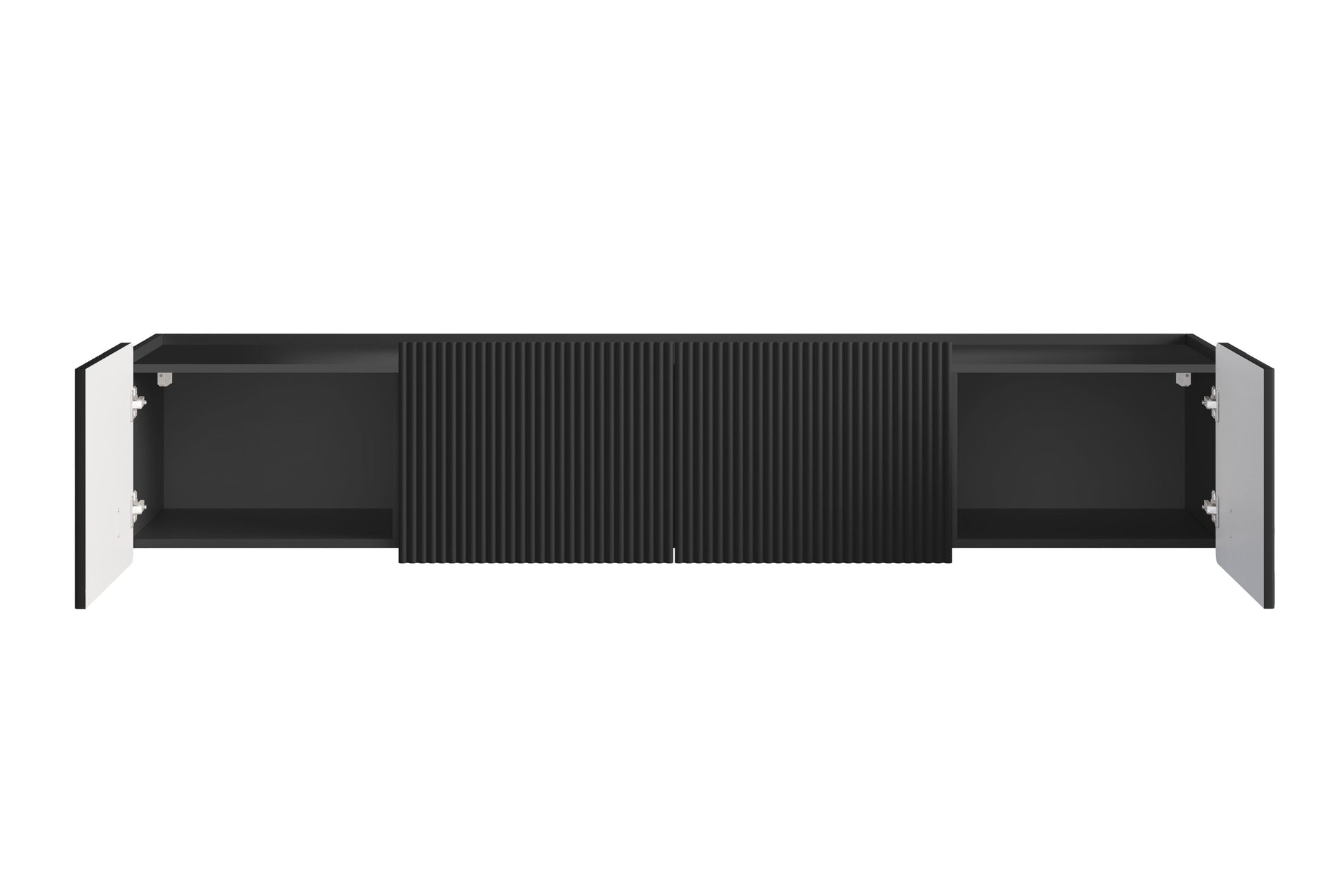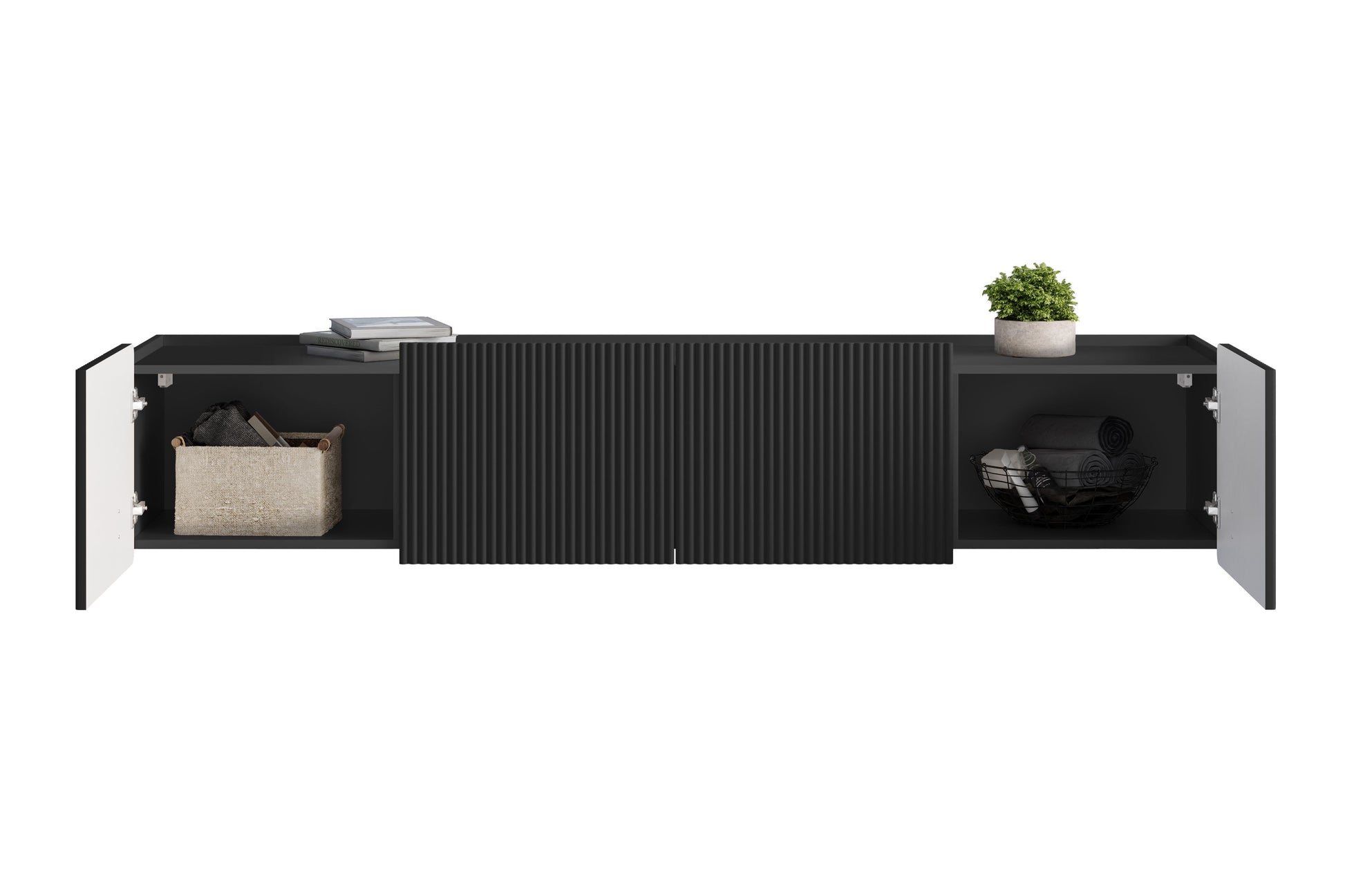 Ontdek de Malmi TV-meubel 200 cm, hangend in mat zwart met goud, dé keuze voor een moderne en luxe uitstraling in uw woonkamer. Het tijdloze ontwerp met afgeronde, geribbelde MDF-fronten en strakke lijnen past perfect bij hedendaagse interieurs. De combinatie van diepe, matte zwarttinten en subtiele gouden accenten zorgt direct voor een elegante sfeer. Dankzij het minimalistische design zonder zichtbare handgrepen oogt het meubel extra stijlvol en geordend.
