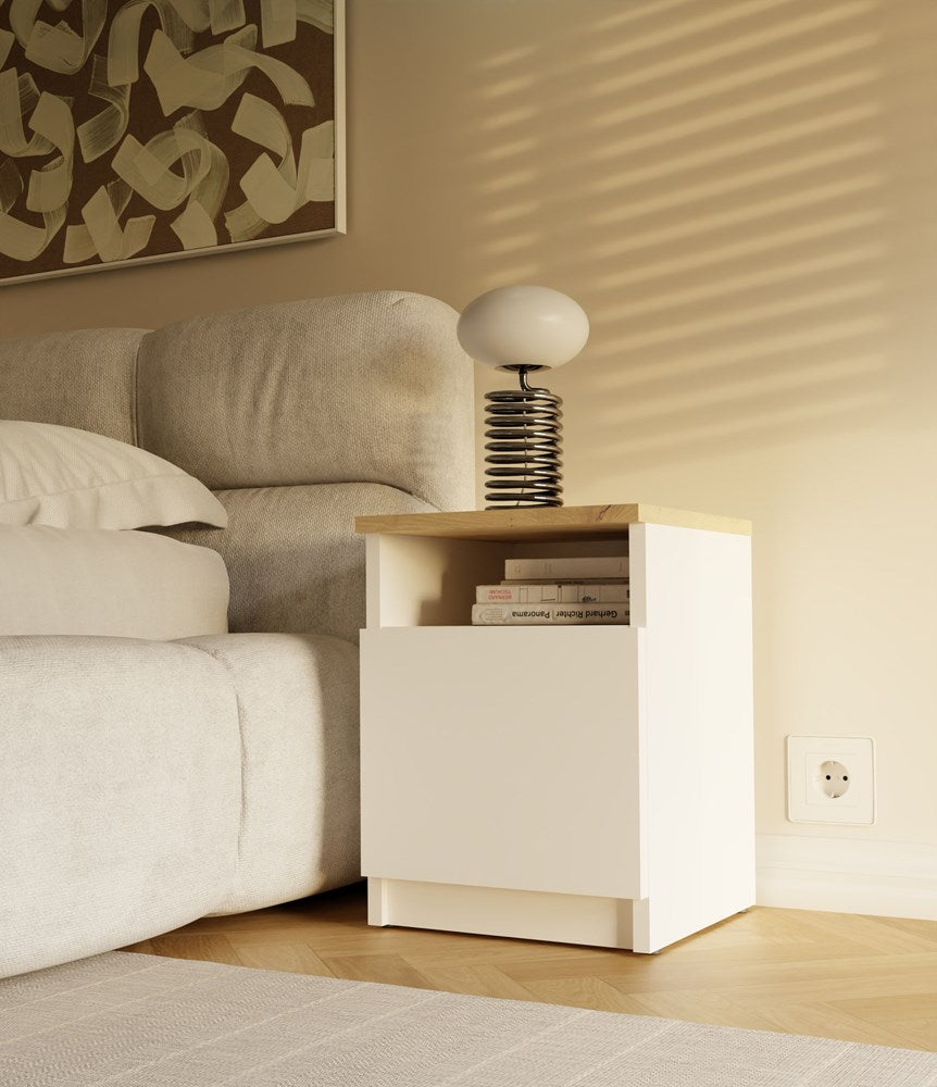 Het GALAX 30 1D nachtkastje combineert modern design met praktische functionaliteit, ideaal voor elke slaapkamer. Met een stijlvol wit lichaam en een ambachtelijk eiken tafelblad straalt het kastje frisheid en lichtheid uit. De kast is uitgerust met een open plank en een afgesloten ruimte achter de deur, perfect voor het opbergen van boeken, telefoons of accessoires. Dankzij het TIP-ON systeem open je de deur eenvoudig met een lichte druk. Greeploze fronten en een solide, Poolse afwerking maken het nachtkastje geschikt voor zowel moderne als klassieke interieurs.