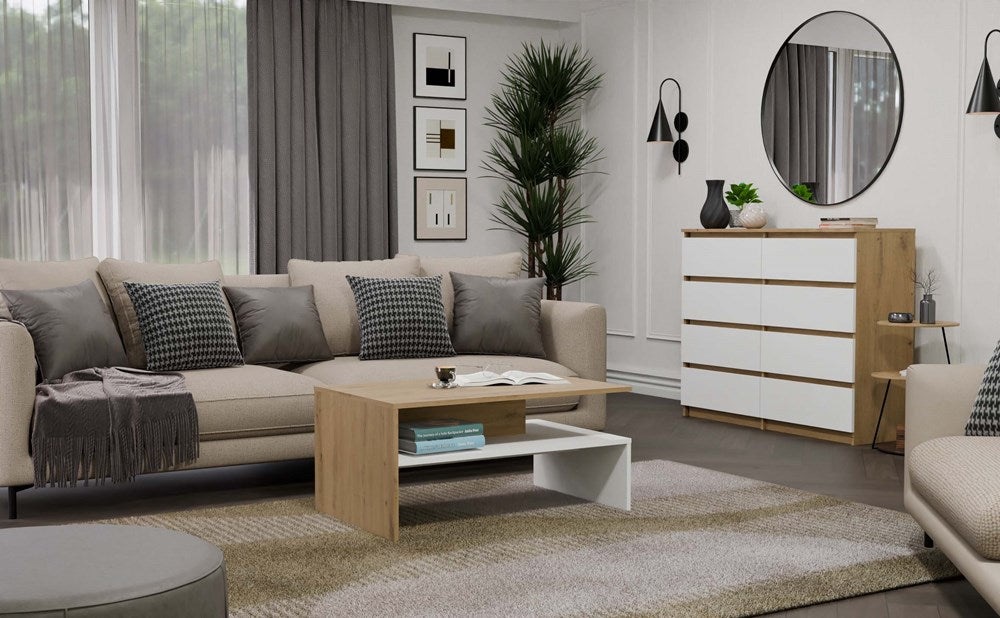De Boston koffietafel is de perfecte keuze voor wie stijl en functionaliteit wil combineren. Dankzij het minimalistische ontwerp en de harmonieuze kleurencombinatie van artisan eiken en wit, past deze tafel moeiteloos in elk modern interieur. Gemaakt van 16 mm gelamineerd karton biedt deze koffietafel een lichte, stevige constructie met een hoogwaardige afwerking. De gladde zijkanten zonder doppen en het nieuwe type beslag onderstrepen zijn strakke uitstraling. Ideaal voor gebruik in de woonkamer, kamer of kantoor en geproduceerd door een Poolse fabrikant met oog voor kwaliteit.