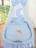 En vacker spjälsäng tillverkad av naturmaterial, den största på marknaden. Färdigställd i harmoniska naturliga rotting- och träfärger. Detta kompletta paket innehåller allt du behöver, inklusive sängkläder och en glad gardin, som visas på bilden.