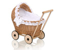 Snygg och unik dockvagn, handgjord av naturlig polsk rotting på ett robust trächassi med trähjul. Denna vackra dockvagn är en perfekt present till små flickor och utmärker sig med sin högkvalitativa, handgjorda finish.