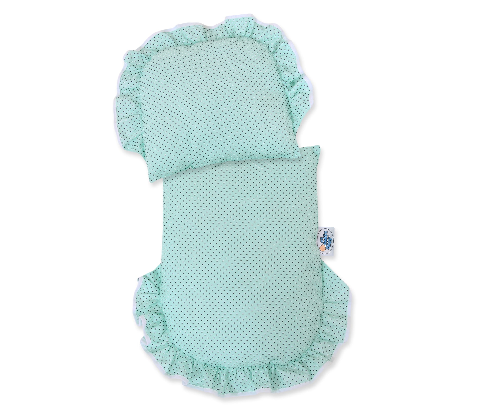 - Inkluderar mintfärgad dockklädsel: kudde och täcke med romantiska volanger