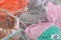 - Komplett set med grå bomullsklädsel inklusive en dekorativ filt med volanger