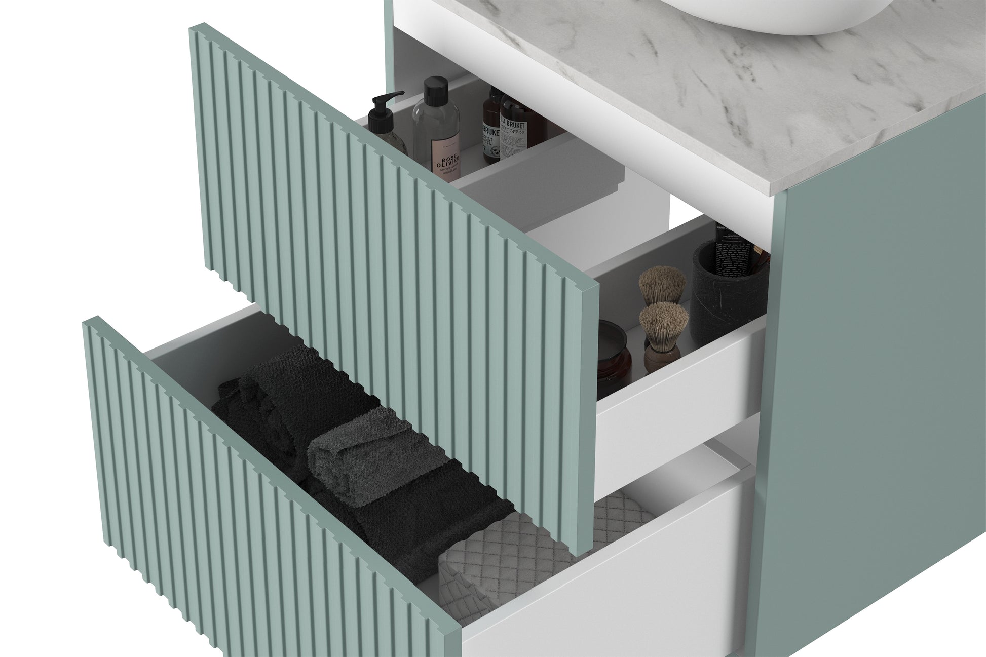 Het minimalistische ontwerp en de unieke saliekleur maken deze wastafelkast ideaal voor moderne en strakke interieurs. De ruime lades bieden praktische opbergruimte voor toiletartikelen, handdoeken en meer. Door het zwevende ontwerp blijft uw vloer vrij, wat schoonmaken vergemakkelijkt en een ruimtelijk effect geeft. Combineer deze stijlvolle kast eenvoudig met witte, grijze of zwarte accessoires voor een frisse en originele uitstraling in iedere badkamer. Profiteer snel, want het aanbod is beperkt!