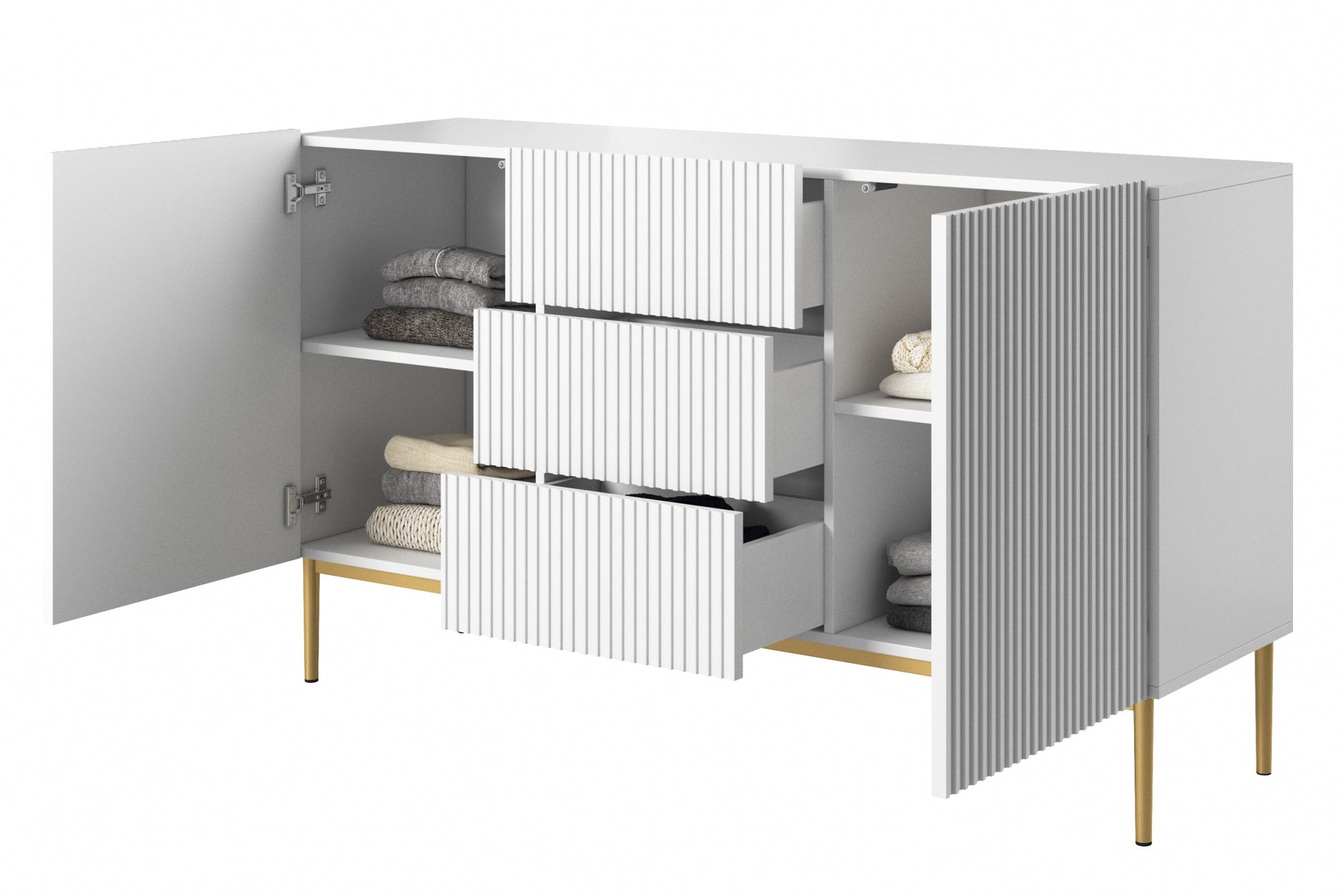 De Nicole ladekast van 150 cm in mat wit met gouden poten brengt een unieke combinatie van stijl en functionaliteit in uw interieur. De minimalistische, matte afwerking en elegante gouden, gepoedercoate poten creëren een moderne, luxe uitstraling. Gegroefde MDF-fronten van 18 mm geven het meubel een opvallend designkarakter. Met zijn solide constructie van gelamineerd karton en MDF-fronten is deze ladekast bestand tegen dagelijks gebruik en biedt hij jarenlange duurzaamheid en elegantie.