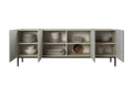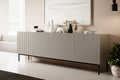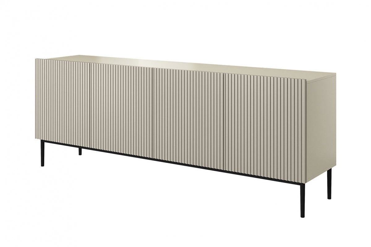 Deze Nicole ladekast combineert stijlvol design met praktische opbergruimte en past perfect in ieder modern interieur. Het mat kasjmieren front met gegroefde structuur straalt luxe uit, terwijl de slanke zwarte metalen poten het minimalistische karakter benadrukken. Dankzij het elegante ontwerp zonder handgrepen lijkt de kast extra licht, en wordt uw woonkamer, slaapkamer of kantoor direct voorzien van een exclusieve uitstraling. De solide constructie met duurzame materialen belooft een langdurige levensduur en veel dagelijks gebruiksgemak. Met vier deuren en in hoogte verstelbare planken biedt deze ladekast optimaal opbergcomfort.
