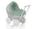 Dockvagn i rotting, grå med pastellgrön klädsel och mjuk vaddering