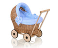 Dockvagn, rottingvagn, handgjord och ekologisk – med mjuk blå klädsel